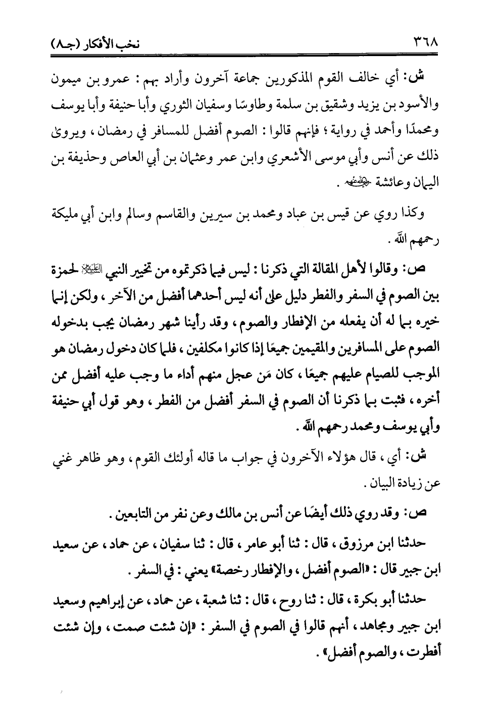 ش: أي خالف القوم المذكورين جماعة آخرون وأراد بهم: عمرو بن ميمون والأسود بن يزيد وشقيق بن سلمة وطاوسًا وسفيان الثوري وأبا حنيفة وأبا يوسف ومحمدًا وأحمد في رواية؛ فإنهم قالوا: الصوم أفضل للمسافر في رمضان، ويروى ذلك عن أنس وأبي موسى الأشعري وابن عمر وعثمان بن أبي العاص وحذيفة بن اليمان وعائشة - رضي الله عنهم -.