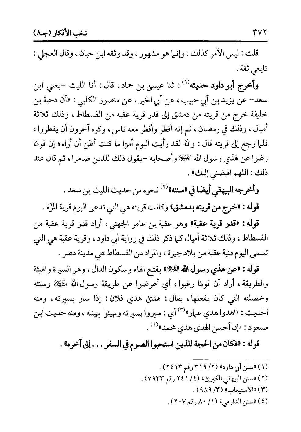 وأخرج أبو داود حديثه (¬1): ثنا عيسى بن حماد، قال: أنا الليث -يعني ابن سعد- عن يزيد بن أبي حبيب، عن أبي الخير، عن منصور الكلبي: "أن دحية بن خليفة خرج من قريته من دمشق إلى قدر قرية عقبه من الفسطاط، وذلك ثلاثة أميال، وذلك في رمضان، ثم إنه أفطر وأفطر معه ناس، وكره آخرون أن يفطروا، فلما رجع إلى قريته قال: والله لقد رأيت اليوم أمرًا ما كنت أظن أن أراه؛ إن قومًا رغبوا عن هَدْي رسول الله - عليه السلام - وأصحابه- يقول ذلك للذين صاموا، ثم قال عند ذلك: اللهم اقبضني إليك".