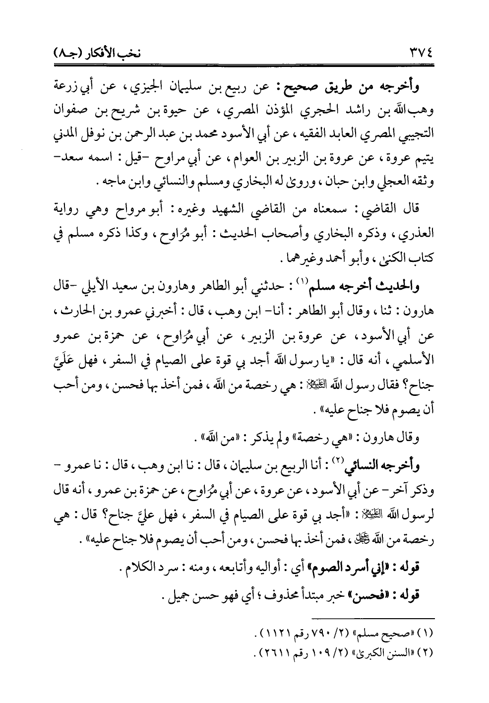 والحديث أخرجه مسلم (¬1): حدثني أبو الطاهر وهارون بن سعيد الأيلي- قال هارون: ثنا، وقال أبو الطاهر: أنا- ابن وهب، قال: أخبرني عمرو بن الحارث، عن أبي الأسود، عن عروة بن الزبير، عن أبي مُرَاوح، عن حمزة بن عمرو الأسلمي، أنه قال: "يا رسول الله أجد بي قوة على الصيام في السفر، فهل عَلَيَّ جناح؟ فقال رسول الله - عليه السلام -: هي رخصة من الله، فمن أخذ بها فحسن، ومن أحب أن يصوم فلا جناح عليه".