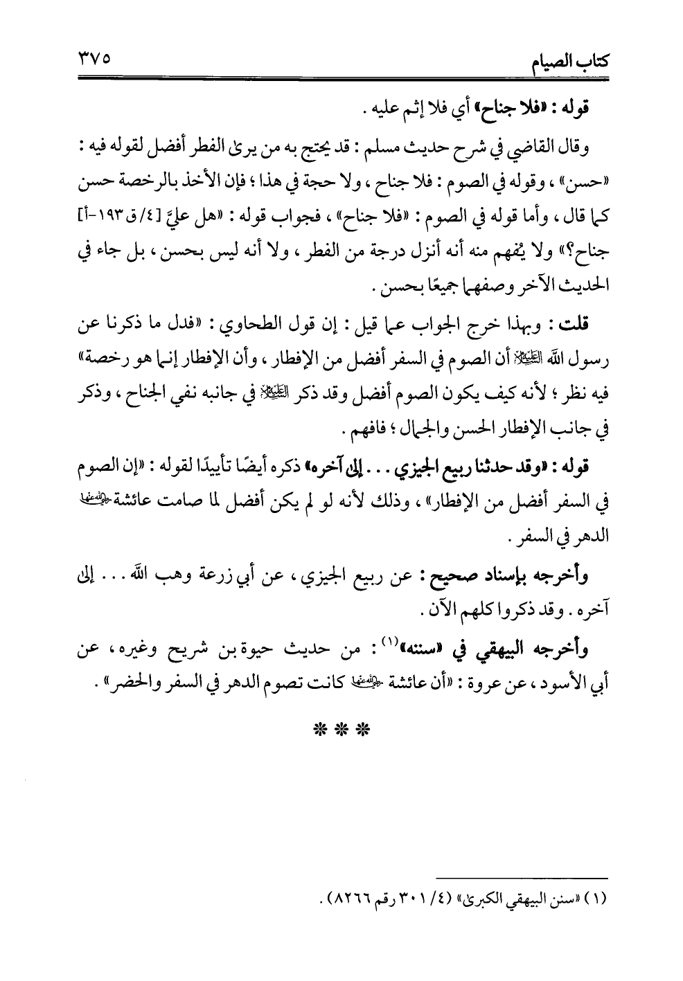 قلت: وبهذا خرج الجواب عما قيل: إن قول الطحاوي: "فدل ما ذكرنا عن رسول الله - عليه السلام - أن الصوم في السفر أفضل من الإفطار، وأن الإفطار إنما هو رخصة" فيه نظر؛ لأنه كيف يكون الصوم أفضل وقد ذكر - عليه السلام - في جانبه نفي الجناح، وذكر في جانب الإفطار الحسن والجمال؛ فافهم.