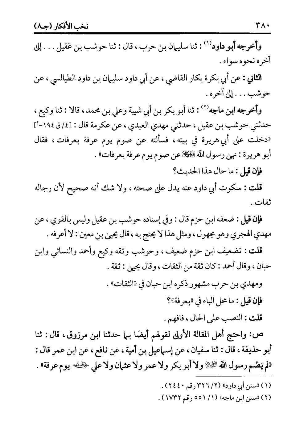 وأخرجه ابن ماجه (¬2): ثنا أبو بكر بن أبي شيبة وعلي بن محمَّد، قالا: ثنا وكيع، حدثني حوشب بن عقيل، حدثني مهدي العبدي، عن عكرمة قال: "دخلت على أبي هريرة في بيته، فسألته عن صوم يوم عرفة بعرفات، فقال أبو هريرة: نهى رسول الله - عليه السلام - عن صوم يوم عرفة بعرفات".