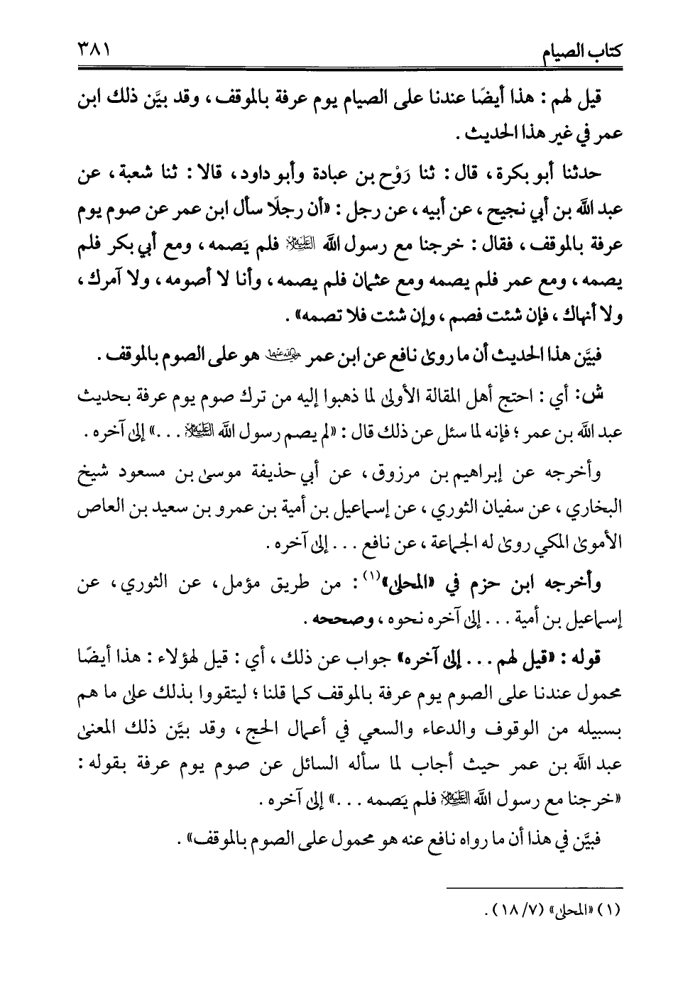 فبيَّن في هذا أن ما رواه نافع عنه هو محمول على الصوم بالموقف".