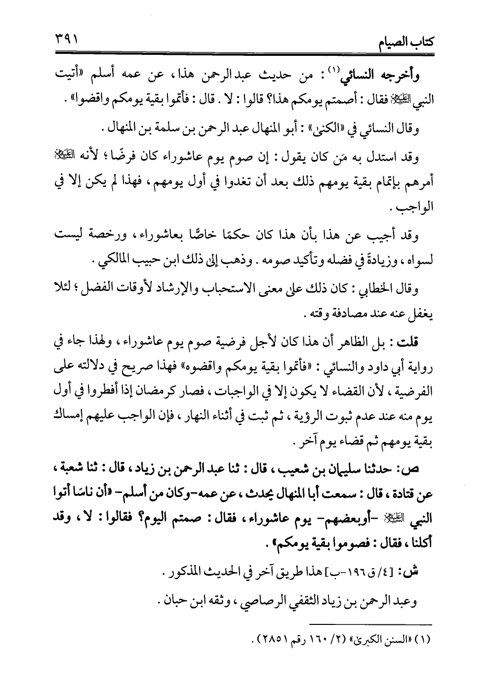 قلت: بل الظاهر أن هذا كان لأجل فرضية صوم يوم عاشوراء، ولهذا جاء في رواية أبي داود والنسائي: "فأتموا بقية يومكم واقضوه" فهذا صريح في دلالته على الفرضية؛ لأن القضاء لا يكون إلا في الواجبات، فصار كرمضان إذا أفطروا في أول يوم منه عند عدم ثبوت الرؤية، ثم ثبت في أثناء النهار، فإن الواجب عليهم إمساك بقية يومهم ثم قضاء يوم آخر.