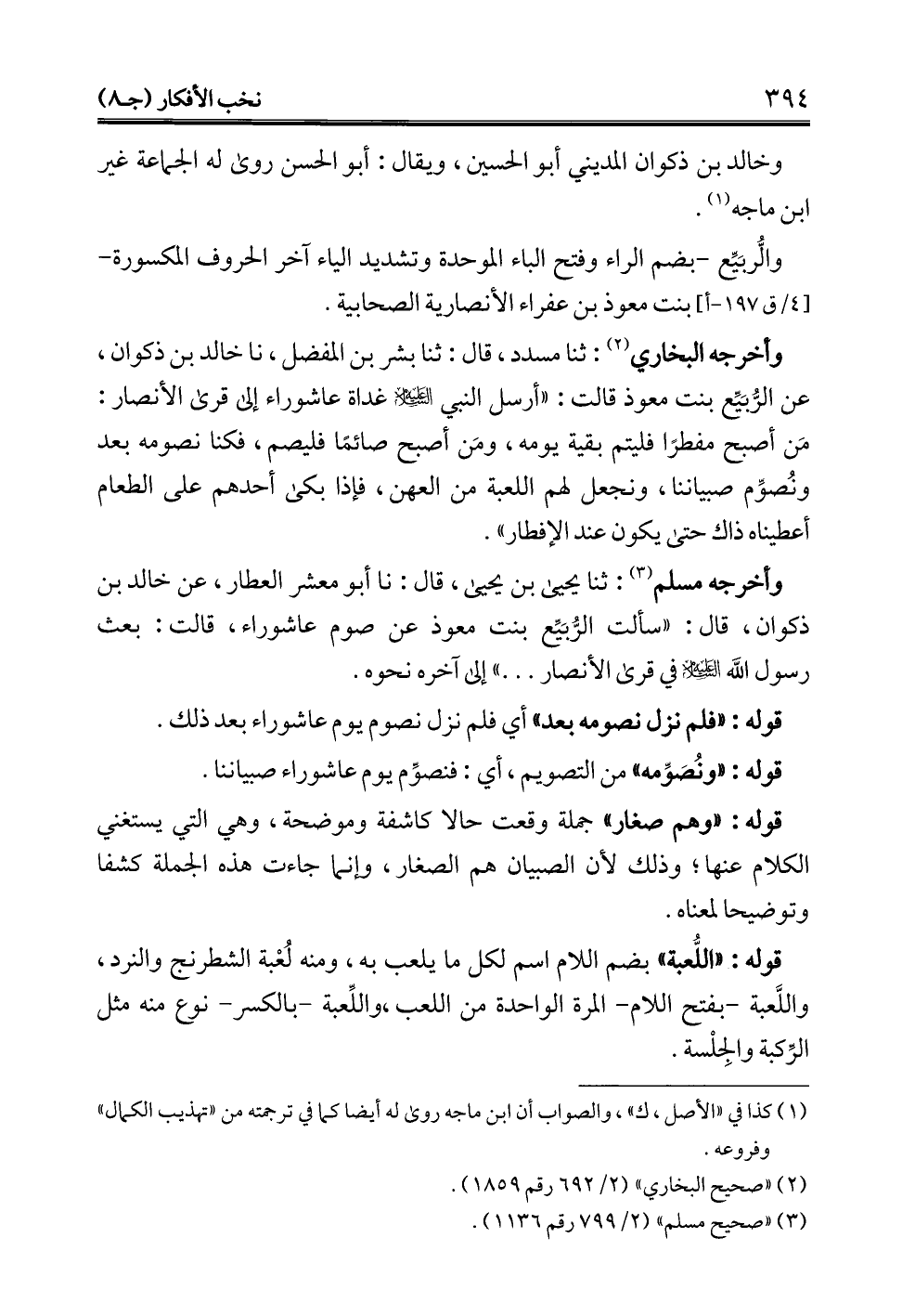 وأخرجه البخاري (¬2): ثنا مسدد، قال: ثنا بشر بن المفضل، نا خالد بن ذكوان، عن الرُّبَيَعّ بنت معوذ قالت: "أرسل النبي - عليه السلام - غداة عاشوراء إلى قرى الأنصار: مَن أصبح مفطرًا فليتم بقية يومه، ومَن أصبح صائمًا فليصم، فكنا نصومه بعد ونُصوِّم صبياننا، ونجعل لهم اللعبة من العهن، فإذا بكى أحدهم على الطعام أعطيناه ذاك حتى يكون عند الإفطار".