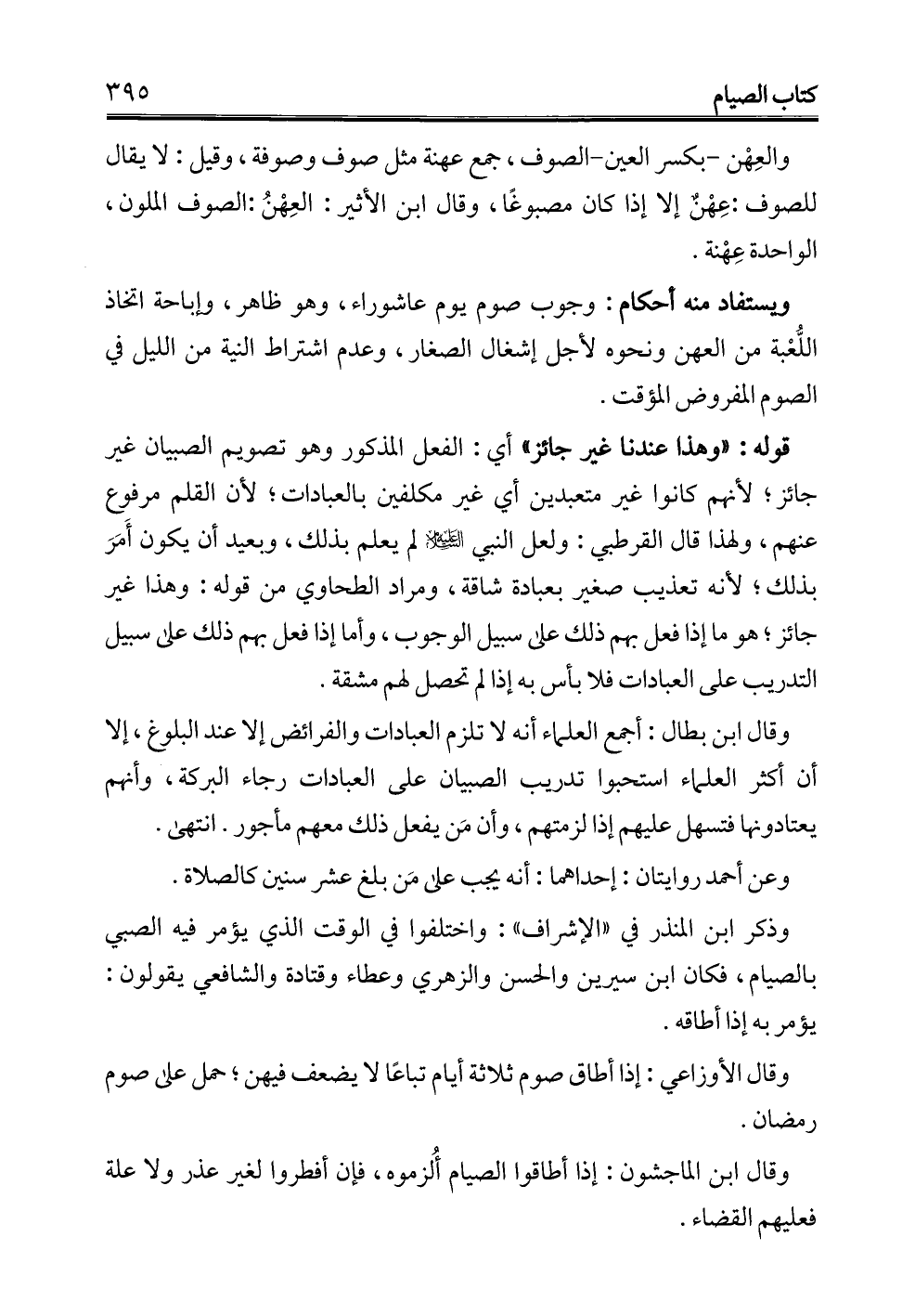 ويستفاد منه أحكام: وجوب صوم يوم عاشوراء، وهو ظاهر، وإباحة اتخاذ اللُّعْبة من العهن ونحوه لأجل إشغال الصغار، وعدم اشتراط النية من الليل في الصوم المفروض المؤقت.