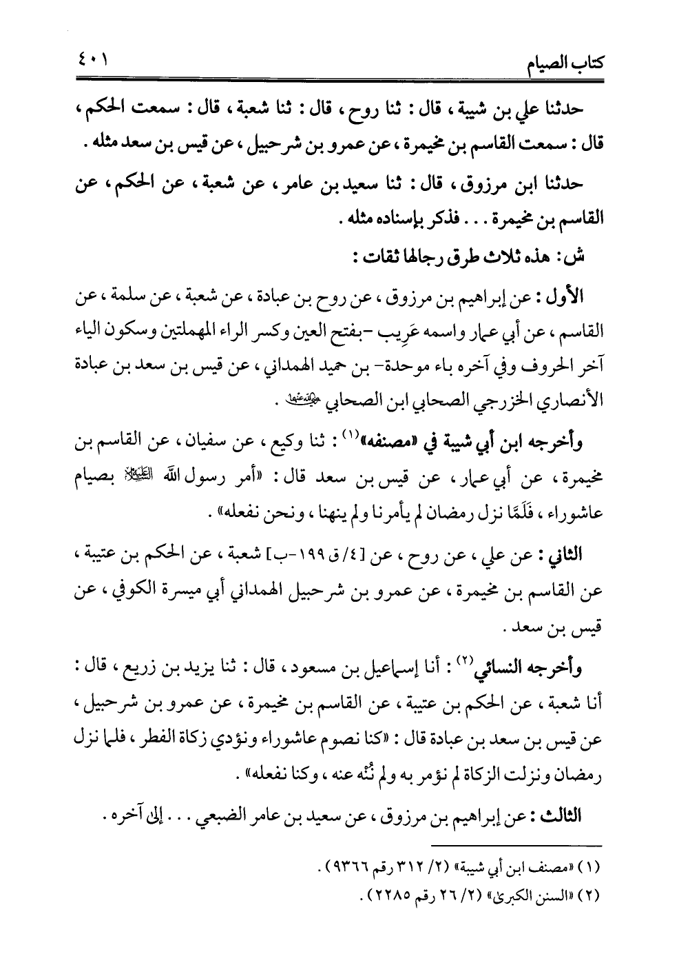 وأخرجه النسائي (¬2): أنا إسماعيل بن مسعود، قال: ثنا يزيد بن زريع، قال: أنا شعبة، عن الحكم بن عتيبة، عن القاسم بن مخيمرة، عن عمرو بن شرحبيل، عن قيس بن سعد بن عبادة قال: "كنا نصوم عاشوراء ونؤدي زكاة الفطر، فلما نزل رمضان ونزلت الزكاة لم نؤمر به ولم ننه عنه، وكنا نفعله".