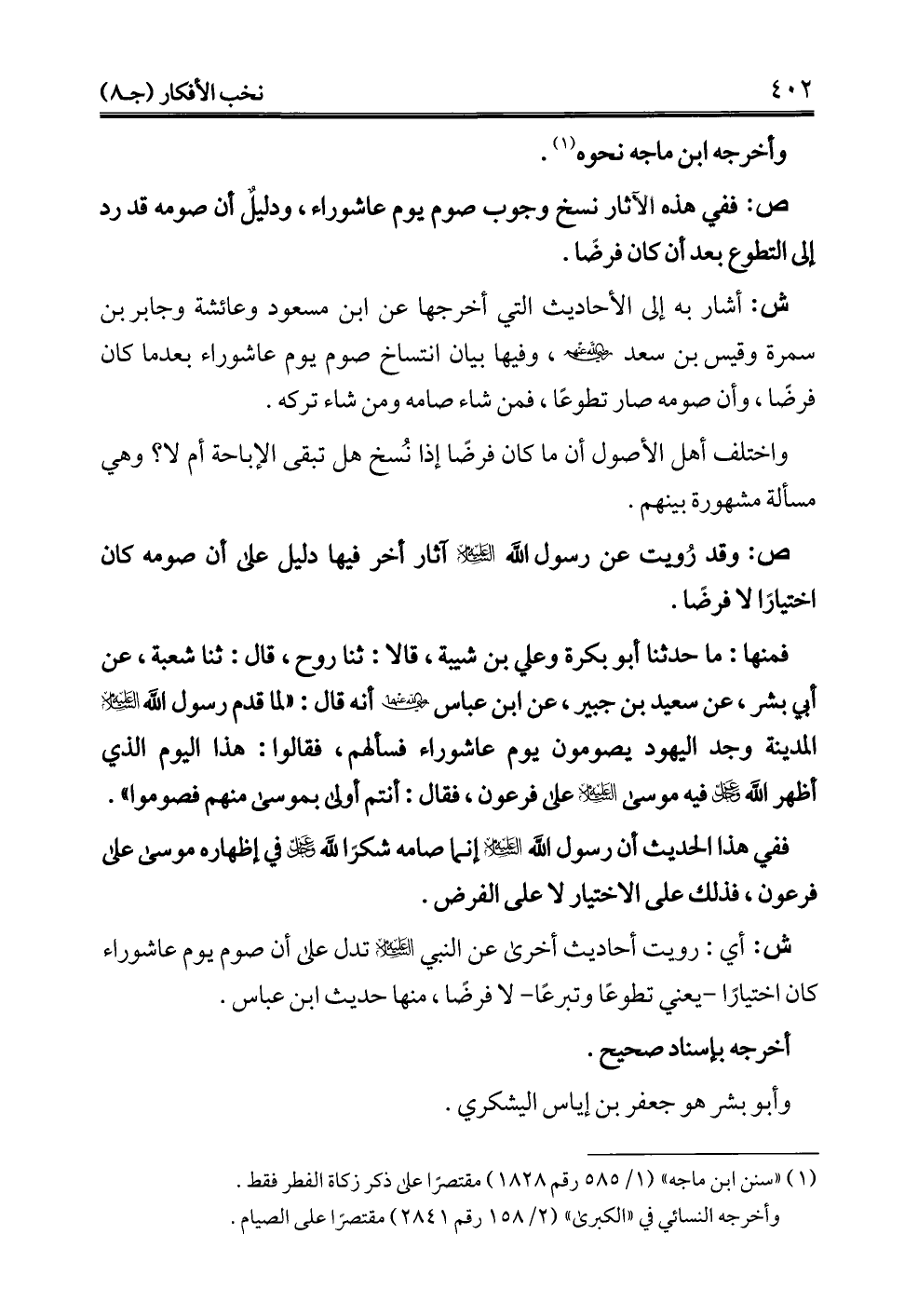 ص: ففي هذه الآثار نسخ وجوب صوم يوم عاشوراء، ودليل أن صومه قد رد إلى التطوع بعد أن كان فرضًا.