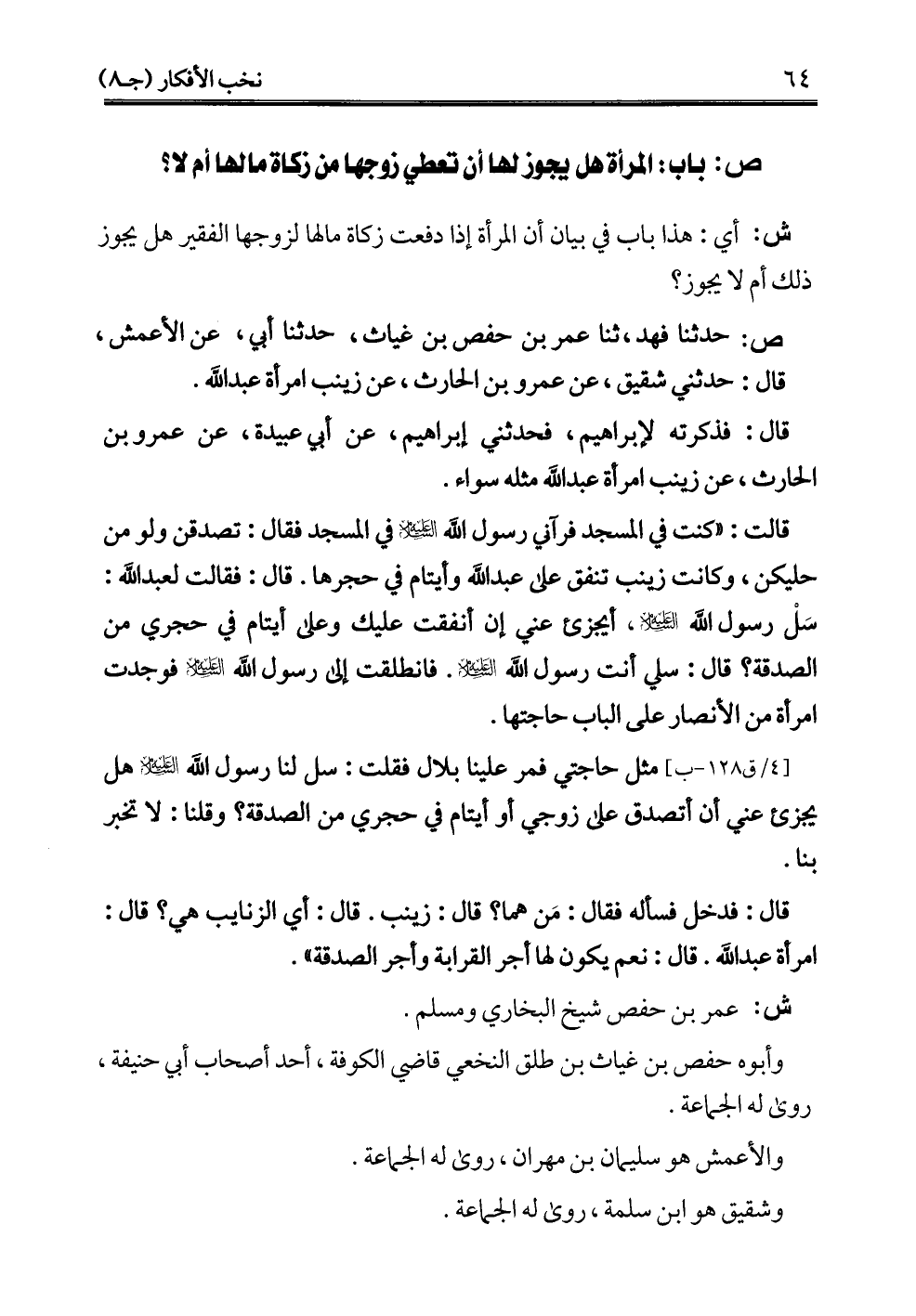 ص: حدثنا فهد، ثنا عمر بن حفص بن غياث، حدثنا أبي، عن الأعمش، قال: حدثني شقيق، عن عمرو بن الحارث، عن زينب امرأة عبد الله.
