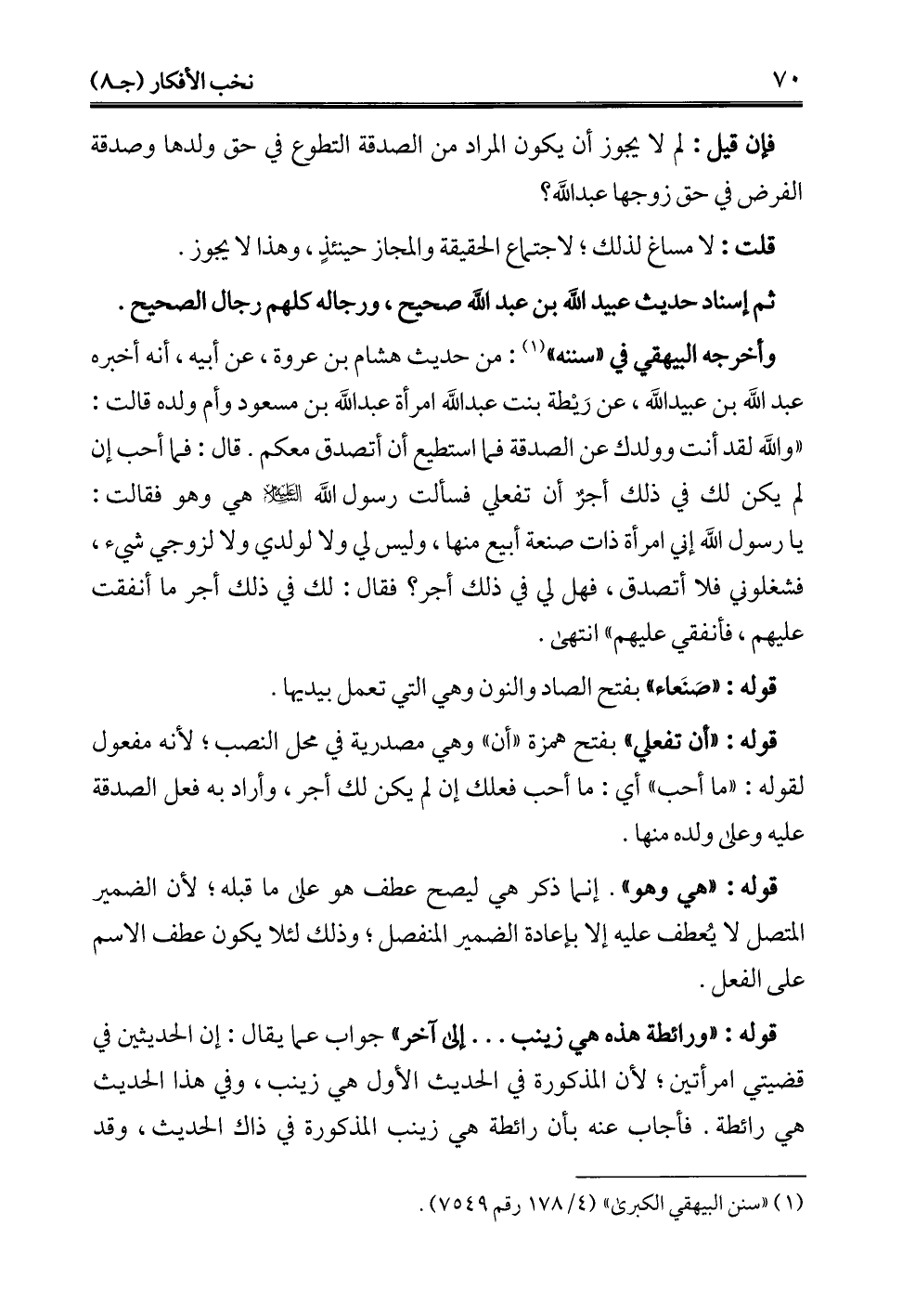 وأخرجه البيهقي في "سننه" (¬1): من حديث هشام بن عروة، عن أبيه، أنه أخبره عبد الله بن عبيد الله، عن رَيْطة بنت عبد الله امرأة عبد الله بن مسعود وأم ولده قالت: "والله لقد أنت وولدك عن الصدقة فما استطيع أن أتصدق معكم. قال: فما أحب إن لم يكن لك في ذلك أجرٌ أن تفعلي فسألت رسول الله - عليه السلام - هي وهو فقالت: يا رسول الله إني امرأة ذات صنعة أبيع منها، وليس لي ولا لولدي ولا لزوجي شيء، فشغلوني فلا أتصدق، فهل لي في ذلك أجر؟ فقال: لك في ذلك أجر ما أنفقت عليهم، فأنفقي عليهم" انتهى.