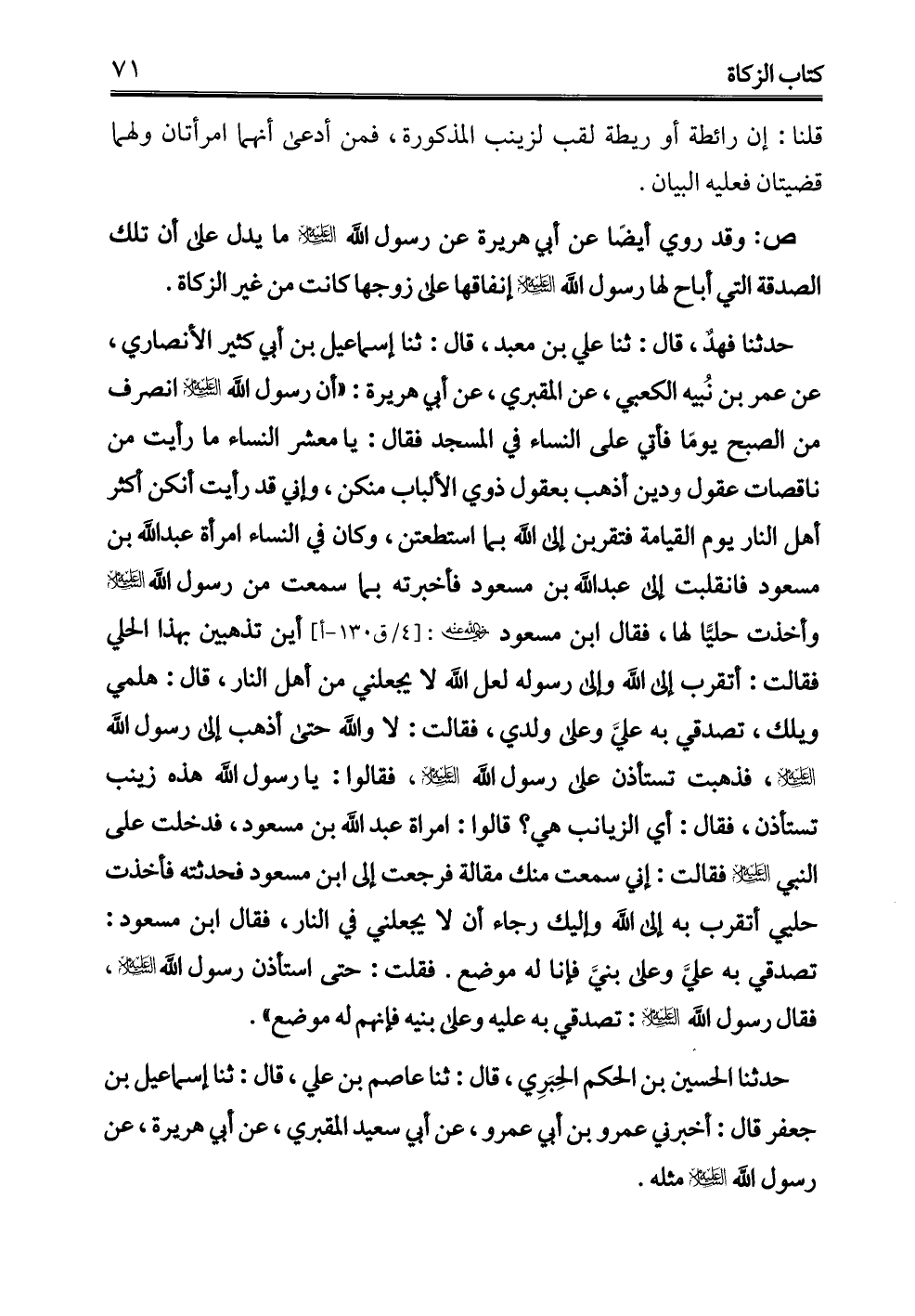 حدثنا فهدٌ، قال: ثنا علي بن معبد، قال: ثنا إسماعيل بن أبي كثير الأنصاري، عن عمر بن نُبيه الكعبي، عن المقبري، عن أبي هريرة: "أن رسول الله - عليه السلام - انصرف من الصبح يومًا فأتي على النساء في المسجد فقال: يا معشر النساء ما رأيت من ناقصات عقول ودين أذهب بعقول ذوي الألباب منكن، وإني قد رأيت أنكن أكثر أهل النار يوم القيامة فتقربن إلى الله بما استطعتن، وكان في النساء امرأة عبد الله بن مسعود فانقلبت إلى عبد الله بن مسعود فأخبرته بما سمعت من رسول الله - عليه السلام - وأخذت حليًّا لها، فقال ابن مسعود - رضي الله عنه -: أين تذهبين بهذا الحلي فقالت: أتقرب إلى الله وإلى رسوله لعل الله لا يجعلني من أهل النار، قال: هلمي ويلك، تصدقي به عليَّ وعلى ولدي، فقالت: لا والله حتى أذهب إلى رسول الله - عليه السلام -، فذهبت تستأذن على رسول الله - عليه السلام -، فقالوا: يا رسول الله هذه زينب تستأذن، فقال: أي الزيانب هي؟ قالوا: امراة عبد الله بن مسعود، فدخلت على النبي - عليه السلام - فقالت: إني سمعت منك مقالة فرجعت إلى ابن مسعود فحدثته فأخذت حلي أتقرب به إلى الله وإليك رجاء أن لا يجعلني في النار، فقال ابن مسعود: تصدقي به عليَّ وعلى بنيَّ فإنا له موضع. فقلت: حتى استأذن رسول الله - عليه السلام -، فقال رسول الله - عليه السلام -: تصدقي به عليه وعلى بنيه فإنهم له موضع".