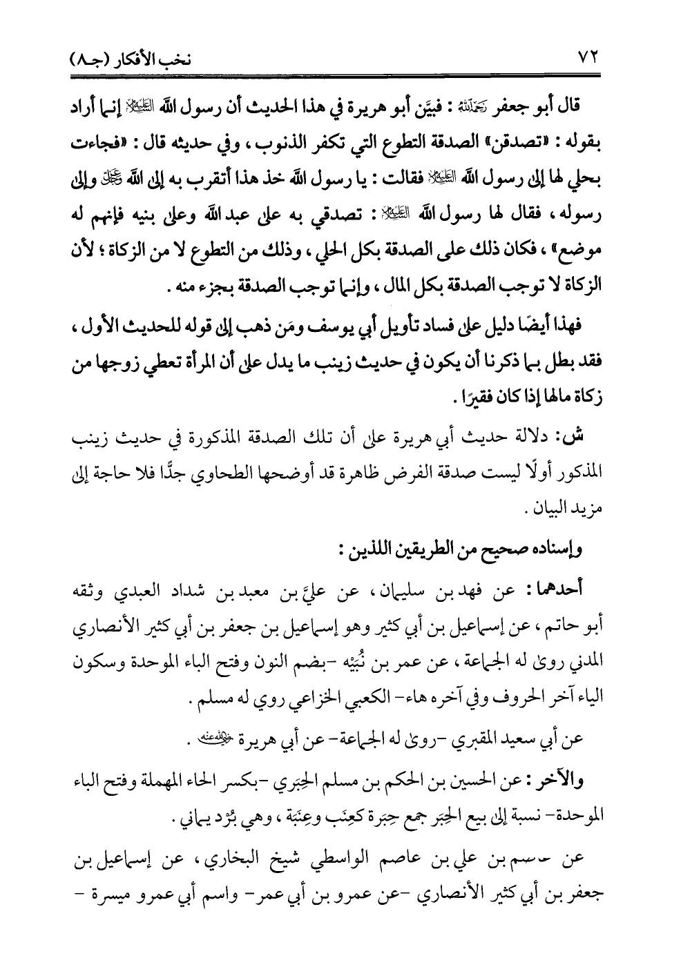 ش: دلالة حديث أبي هريرة على أن تلك الصدقة المذكورة في حديث زينب المذكور أولًا ليست صدقة الفرض ظاهرة قد أوضحها الطحاوي جدًّا فلا حاجة إلى مزيد البيان.