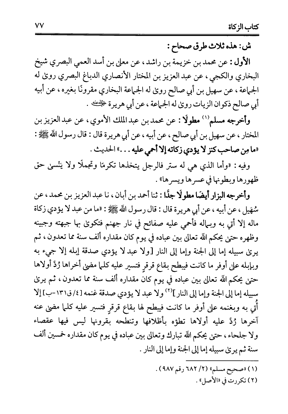 وأخرجه البزار أيضًا مطولًا جدًّا: ثنا أحمد بن أبان، نا عبد العزيز بن محمَّد، عن سُهَيل، عن أبيه، عن أبي هريرة قال: قال رسول الله - صلى الله عليه وسلم -: "ما من عبد لا يؤدي زكاة ماله إلا أتي به وبماله فأحمي عليه صفائح في نار جهنم فتكوى بها جبهته وجبينه وظهره حتى يحكم الله تعالى بين عباده في يوم كان مقداره ألف سنة مما تعدون، ثم يرى سبيله إما إلى الجنة وإما إلى النار [ولا عبد لا يؤدي صدقة إبله إلا جيء به وبإبله على أوفر ما كانت فيبطح بقاع قرقرٍ فتسير عليه كلما مضى أخراها رُدَّ أولاها حتى يحكم الله تعالى بين عباده في يوم كان مقداره ألف سنة مما تعدون، ثم يرى سبيله إما إلى الجنة وإما إلى النار] (¬2) ولا عبد لا يؤدي صدقة غنمه إلا أُتي به وبغنمه على أوفر ما كانت فيبطح لها بقاع قرقرٍ فتسير عليه كلما مضى عنه آخرها رُدَّ عليه أولاها تطؤه بأظلافها وتنطحه بقرونها ليس فيها عقصاء ولا جلحاء، حتى يحكم الله تبارك وتعالى بين عباده في يوم كان مقداره خمسين ألف سنة ثم يرى سبيله إما إلى الجنة وإما إلى النار.