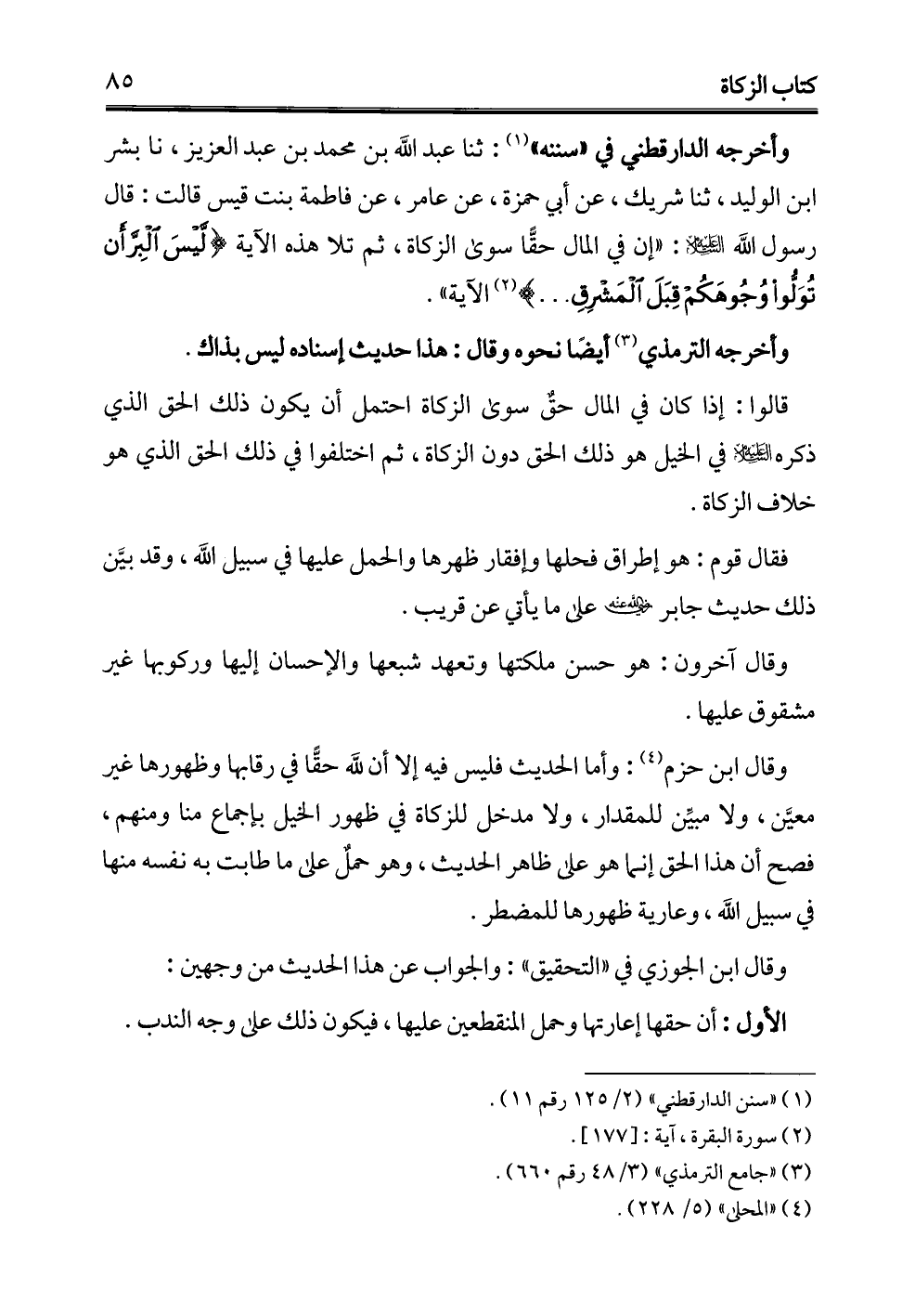 وقال ابن حزم (¬4): وأما الحديث فليس فيه إلا أن لله حقًّا في رقابها وظهورها غير معيَّن، ولا مبيِّن للمقدار، ولا مدخل للزكاة في ظهور الخيل بإجماع منا ومنهم، فصح أن هذا الحق إنما هو على ظاهر الحديث، وهو حملٌ على ما طابت به نفسه منها في سبيل الله، وعارية ظهورها للمضطر.