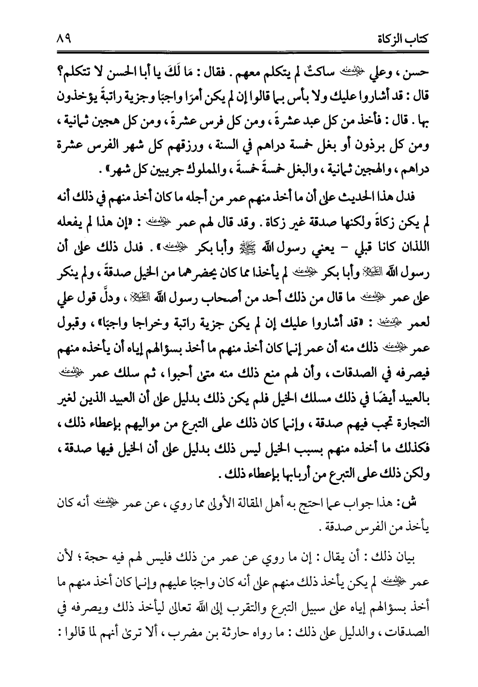 ش: هذا جواب عما احتج به أهل المقالة الأولى مما روي، عن عمر - رضي الله عنه - أنه كان يأخذ من الفرس صدقة.