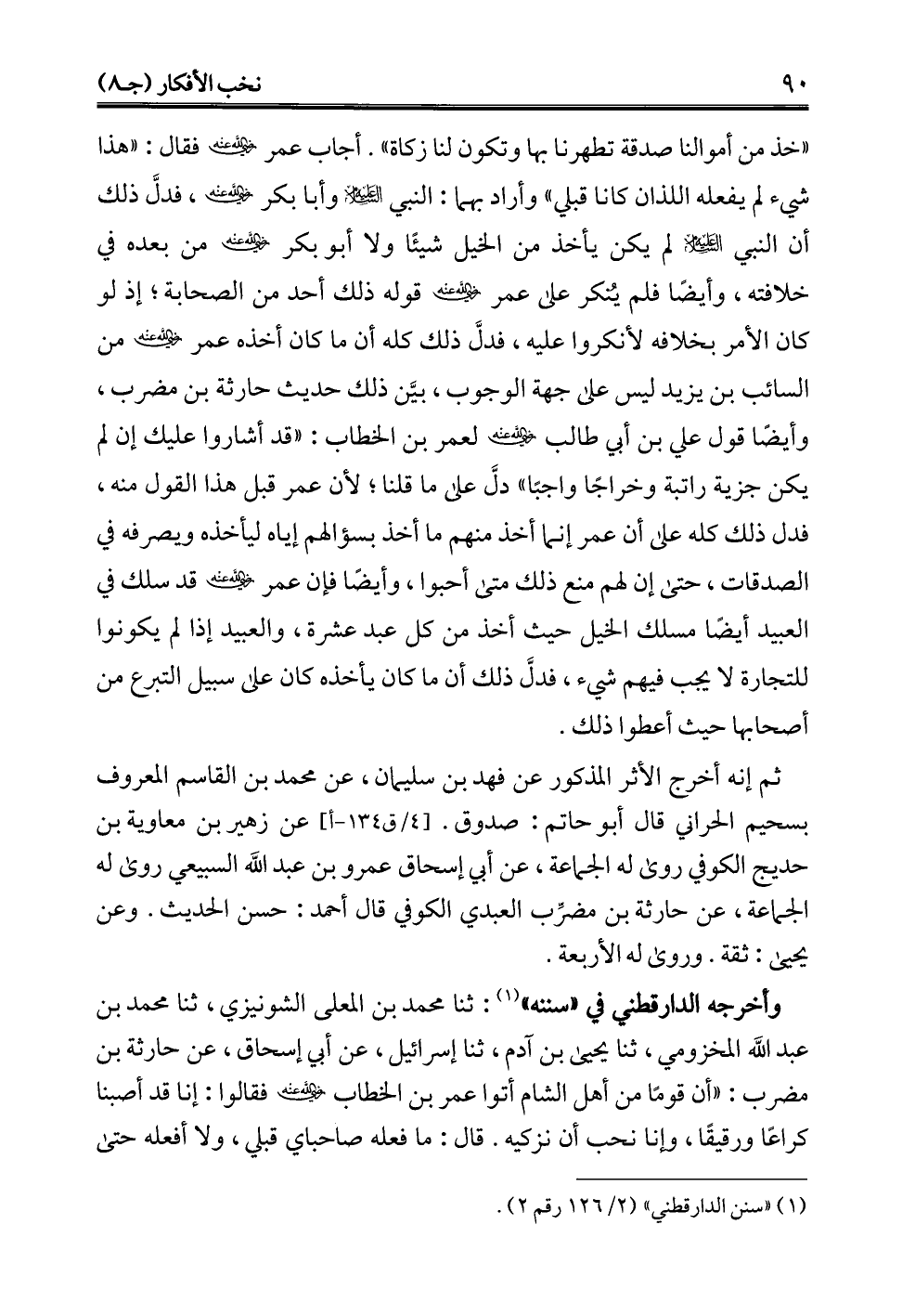 وأخرجه الدارقطني في "سننه" (¬1): ثنا محمَّد بن المعلى الشونيزي، ثنا محمَّد بن عبد الله المخزومي، ثنا يحيى بن آدم، ثنا إسرائيل، عن أبي إسحاق، عن حارثة بن مضرب: "أن قومًا من أهل الشام أتوا عمر بن الخطاب - رضي الله عنه - فقالوا: إنا قد أصبنا كراعًا ورقيقًا، وإنا نحب أن نزكيه. قال: ما فعله صاحباي قبلي، ولا أفعله حتى