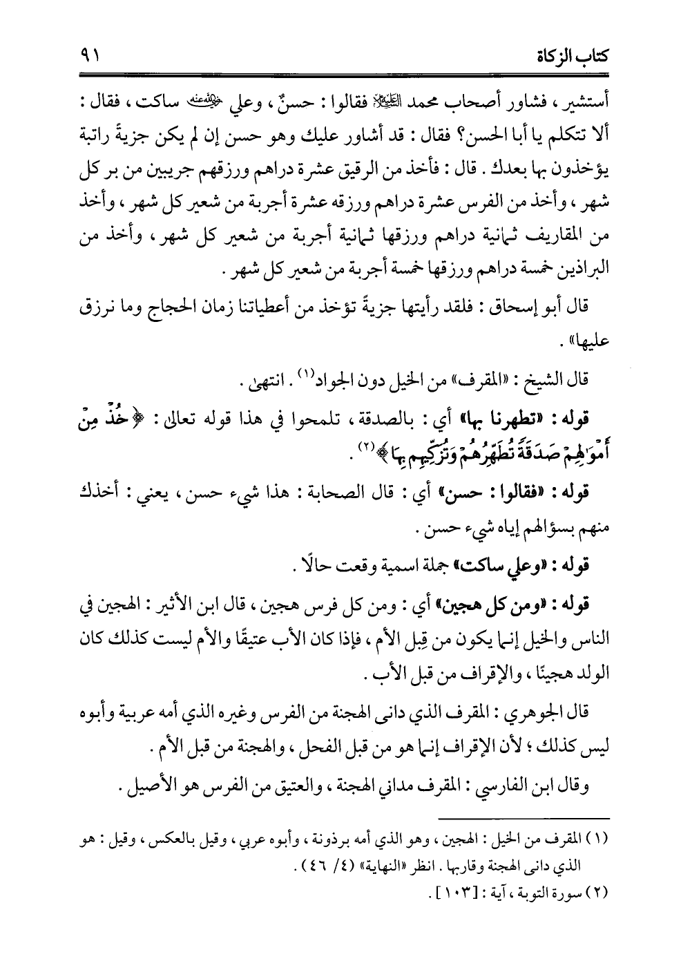 أستشير، فشاور أصحاب محمَّد - عليه السلام - فقالوا: حسنٌ، وعلي - رضي الله عنه - ساكت، فقال: ألا تتكلم يا أبا الحسن؟ فقال: قد أشاور عليك وهو حسن إن لم يكن جزيةً راتبة يؤخذون بها بعدك. قال: فأخذ من الرقيق عشرة دراهم ورزقهم جريبين من بر كل شهر، وأخذ من الفرس عشرة دراهم ورزقه عشرة أجربة من شعير كل شهر، وأخذ من المقاريف ثمانية دراهم ورزقها ثمانية أجربة من شعير كل شهر، وأخذ من البراذين خمسة دراهم ورزقها خمسة أجربة من شعير كل شهر.