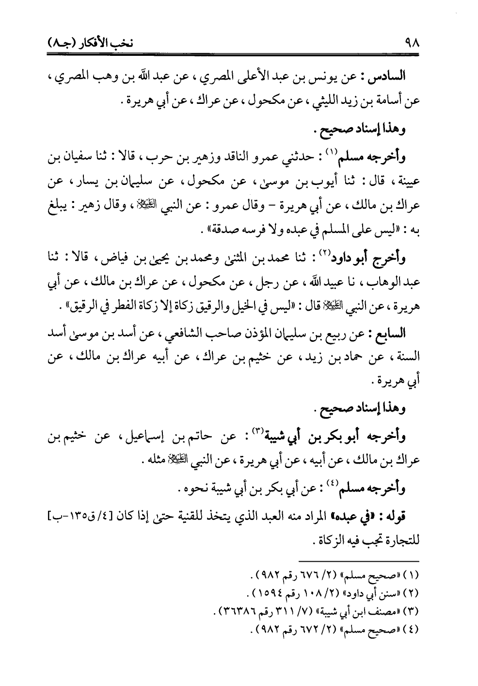 وأخرجه مسلم (¬1): حدثني عمرو الناقد وزهير بن حرب، قالا: ثنا سفيان بن عيينة، قال: ثنا أيوب بن موسى، عن مكحول، عن سليمان بن يسار، عن عراك بن مالك، عن أبي هريرة- وقال عمرو: عن النبي - عليه السلام -، وقال زهير: يبلغ به: "ليس على المسلم في عبده ولا فرسه صدقة".
