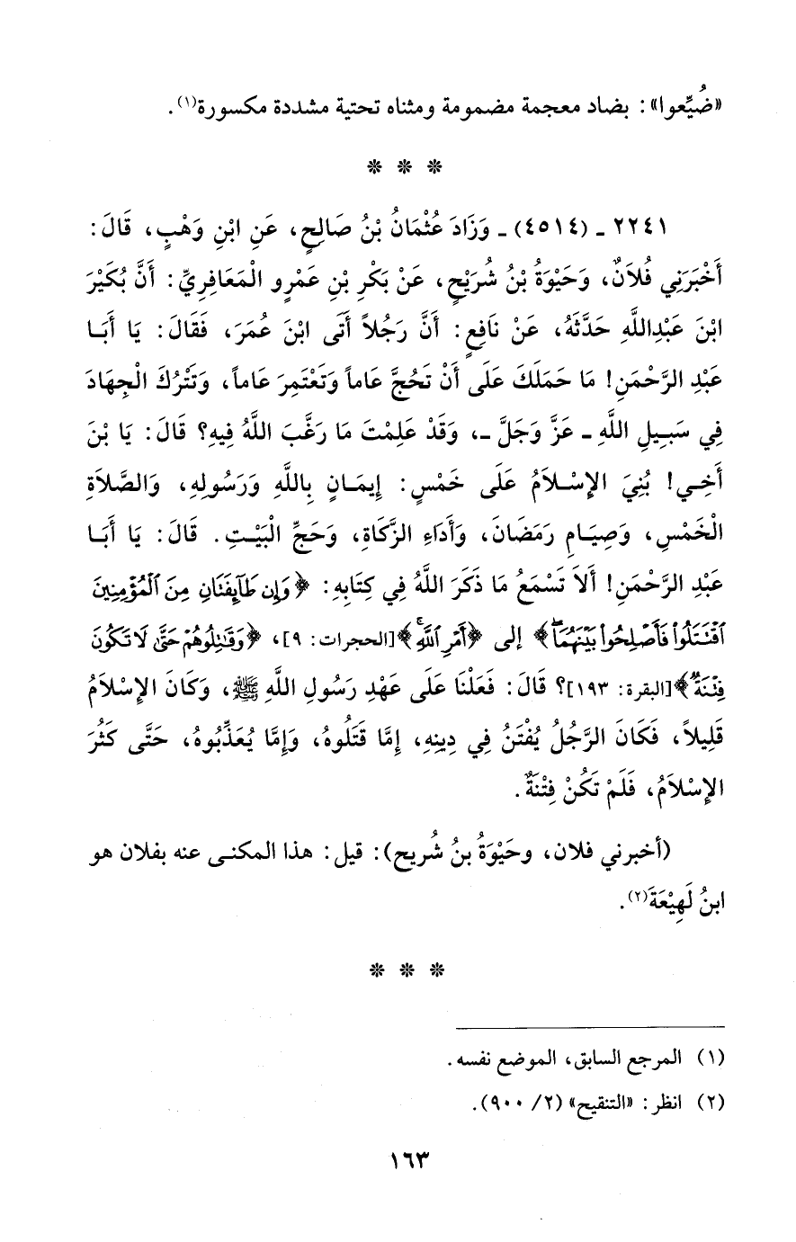 2241 - (4514) - وَزَادَ عُثْمَانُ بْنُ صَالِحٍ، عَنِ ابْنِ وَهْبٍ، قَالَ: أَخْبَرَنِي فُلَانٌ، وَحَيْوَةُ بْنُ شُرَيْحِ، عَنْ بَكْرِ بْنِ عَمْرٍو الْمَعَافِرِيِّ: أَنَّ بُكَيْرَ ابْنَ عَبْدِ اللَّهِ حَدَّثَهُ، عَنْ نَافِعٍ: أَنَّ رَجُلًا أَتَى ابْنَ عُمَرَ، فَقَالَ: يَا أَبَا عَبْدِ الرَّحْمَنِ! مَا حَمَلَكَ عَلَى أَنْ تَحُجَّ عَامًا وَتَعْتَمِرَ عَامًا، وَتَتْرُكَ الْجِهَادَ فِي سَبِيلِ اللَّهِ -عَزَّ وَجَلَّ-، وَقَدْ عَلِمْتَ مَا رَغَّبَ اللَّهُ فِيهِ؟ قَالَ: يَا بْنَ أَخِي! بُنِيَ الإسْلَامُ عَلَى خَمْسٍ: إِيمَانٍ بِاللَّهِ وَرَسُولِهِ، وَالصَّلَاةِ الْخَمْسِ، وَصِيَامِ رَمَضَانَ، وَأَدَاءِ الزَّكَاةِ، وَحَجِّ الْبَيْتِ. قَالَ: يَا أَبَا عَبْدِ الرَّحْمَنِ! أَلَا تَسْمَعُ مَا ذَكَرَ اللَّهُ فِي كتَابِهِ: {وَإِنْ طَائِفَتَانِ مِنَ الْمُؤْمِنِينَ اقْتَتَلُوا فَأَصْلِحُوا بَيْنَهُمَا} إلى {أَمْرِ اللَّهِ} [الحجرات: 9]، {وَقَاتِلُوهُمْ حَتَّى لَا تَكُونَ فِتْنَةٌ} [البقرة: 193]؟ قَالَ: فَعَلْنَا عَلَى عَهْدِ رَسُولِ اللَّهِ - صلى الله عليه وسلم -، وَكَانَ الإِسْلَامُ قَلِيلًا، فَكَانَ الرَّجُلُ يُفْتَنُ فِي دِينِهِ، إِمَّا قَتَلُوهُ، وَإِمَّا يُعَذِّبُوهُ، حَتَّى كَثُرَ الإسْلَامُ، فَلَمْ تَكُنْ فِتْنَةٌ.