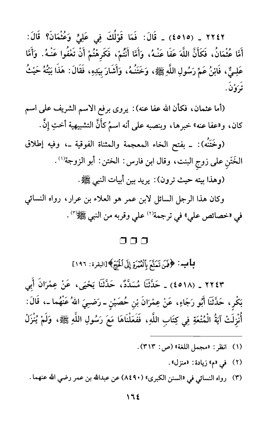 2242 - (4515) - قَالَ: فَمَا قَوْلُكَ فِي عَلِيِّ وَعُثْمَانَ؟ قَالَ: أَمَّا عُثْمَانُ، فَكَأَنَّ اللَّهَ عَفَا عَنْهُ، وَأَمَّا أَنْتُمْ، فَكَرِهْتُمْ أَنْ تَعْفُوا عَنْهُ. وَأَمَّا عَلِيٌّ، فَابْنُ عَمِّ رَسُولِ اللَّهِ - صلى الله عليه وسلم -، وَخَتَنُهُ، وَأَشَارَ بِيَدِهِ، فَقَالَ: هَذَا بَيْتُهُ حَيْثُ تَرَوْنَ.