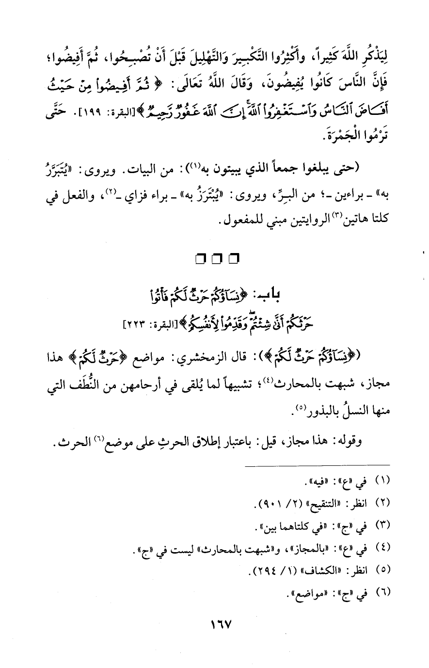 ({نِسَاؤُكُمْ حَرْثٌ لَكُمْ}): قال الزمخشري: مواضع {حَرْثٌ لَكُمْ} هذا مجاز، شبهت بالمحارث (¬4)؛ تشبيهًا لما يُلقى في أرحامهن من النُّطَف التي منها النسلُ بالبذور (¬5).