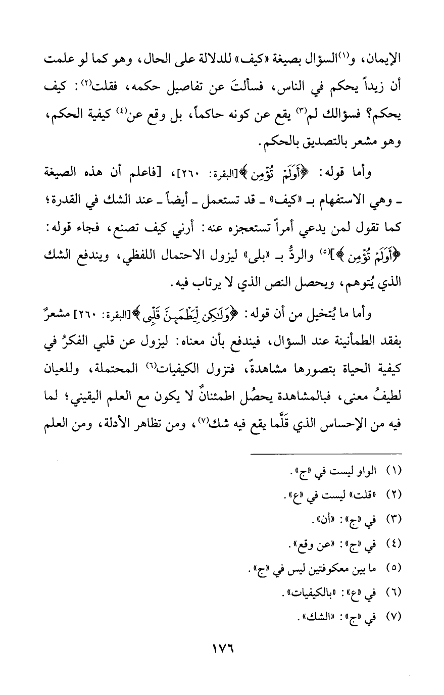 وأما ما يُتخيل من أن قوله: {وَلَكِنْ لِيَطْمَئِنَّ قَلْبِي} [البقرة: 260] مشعرٌ بفقد الطمأنينة عند السؤال، فيندفع بأن معناه: ليزول عن قلبي الفكرُ في كيفية الحياة بتصورها مشاهدةً، فتزول الكيفيات (¬6) المحتملة، وللعيان لطيفُ معنى، فبالمشاهدة يحصُل اطمئنانٌ لا يكون مع العلم اليقيني؛ لما فيه من الإحساس الذي قَلَّما يقع فيه شك (¬7)، ومن تظاهر الأدلة، ومن العلم