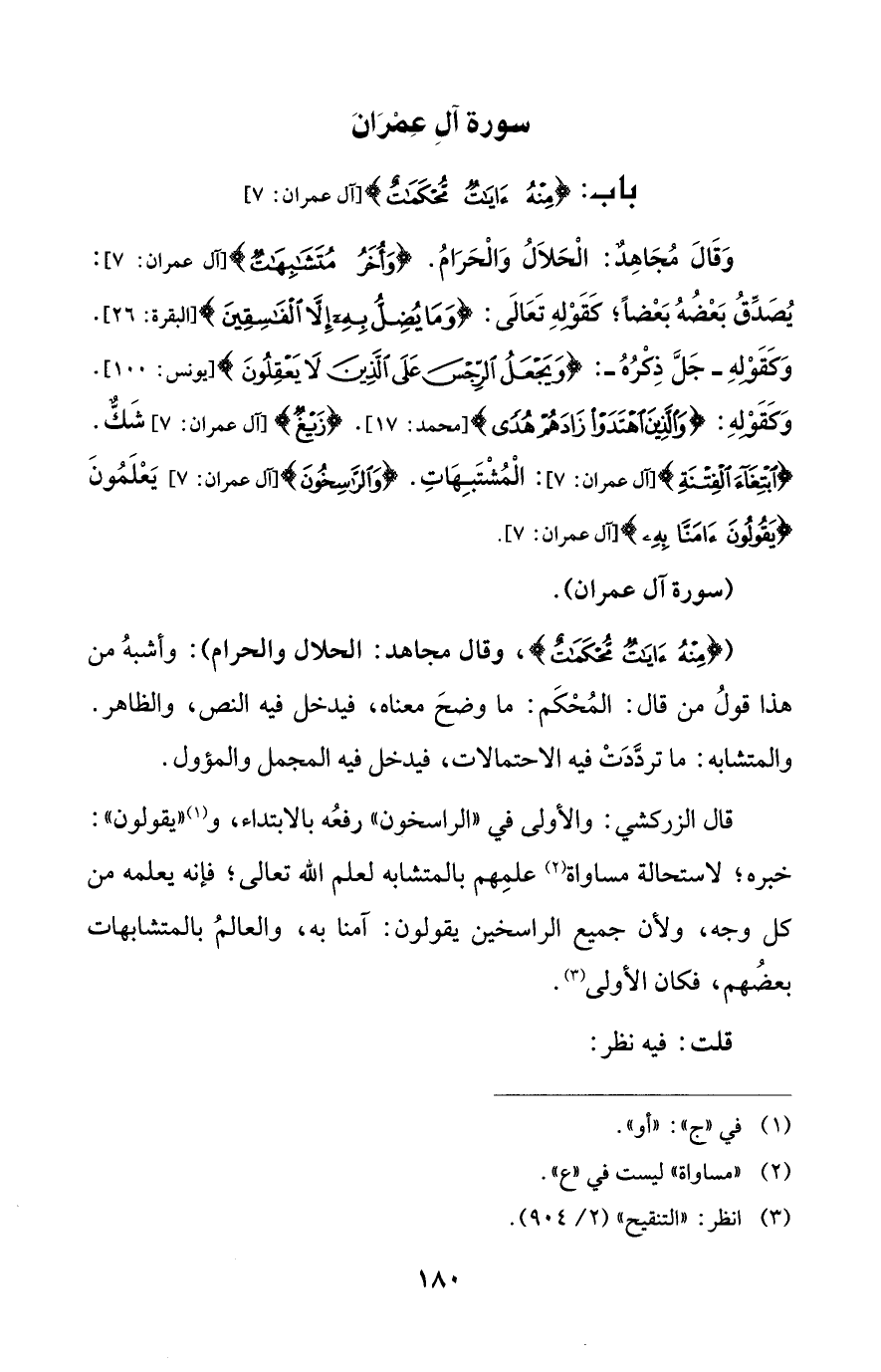 ({مِنْهُ آيَاتٌ مُحْكَمَاتٌ}، وقال مجاهد: الحلال والحرام): وأشبهُ من هذا قولُ من قال: المُحْكَم: ما وضحَ معناه، فيدخل فيه النص، والظاهر. والمتشابه: ما تردَّدَتْ فيه الاحتمالات، فيدخل فيه المجمل والمؤول.