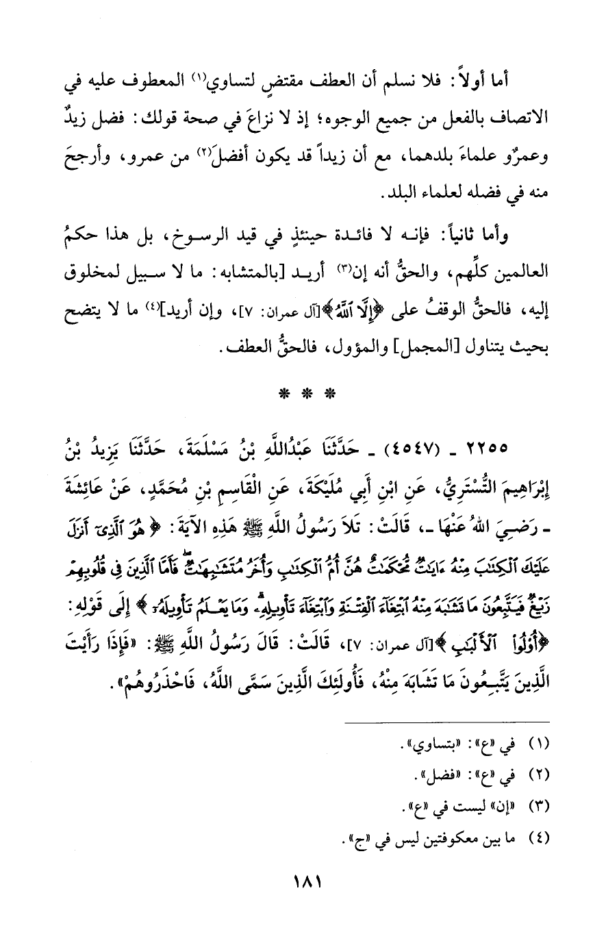 2255 - (4547) - حَدَّثَنَا عَبْدُ اللَّهِ بْنُ مَسْلَمَةَ، حَدَّثَنَا يَزِيدُ بْنُ إِبْرَاهِيمَ التُّسْتَرِيُّ، عَنِ ابْنِ أَبي مُلَيْكَةَ، عَنِ الْقَاسِم بْنِ مُحَمَّدٍ، عَنْ عَائِشَةَ -رَضِيَ اللهُ عَنْهَا-، قَالَتْ: تَلَا رَسُولُ اللَّهِ - صلى الله عليه وسلم - هذِهِ الآيَةَ: {هُوَ الَّذِي أَنْزَلَ عَلَيْكَ الْكِتَابَ مِنْهُ آيَاتٌ مُحْكَمَاتٌ هُنَّ أُمُّ الْكِتَابِ وَأُخَرُ مُتَشَابِهَاتٌ فَأَمَّا الَّذِينَ فِي قُلُوبِهِمْ زَيْغٌ فَيَتَّبِعُونَ مَا تَشَابَهَ مِنْهُ ابْتِغَاءَ الْفِتْنَةِ وَابْتِغَاءَ تَأْوِيلِهِ وَمَا يَعْلَمُ تَأْوِيلَهُ} إِلَى قوله: {أُولُو الْأَلْبَابِ} [آل عمران: 7]، قَالَتْ: قَالَ رَسُولُ اللَّهِ - صلى الله عليه وسلم -: "فَإِذَا رَأَيْتَ الَّذِينَ يَتَّبِعُونَ مَا تَشَابَهَ مِنْهُ، فَأُولَئِكَ الَّذِينَ سَمَّى اللَّهُ، فَاحْذَرُوهُمْ".