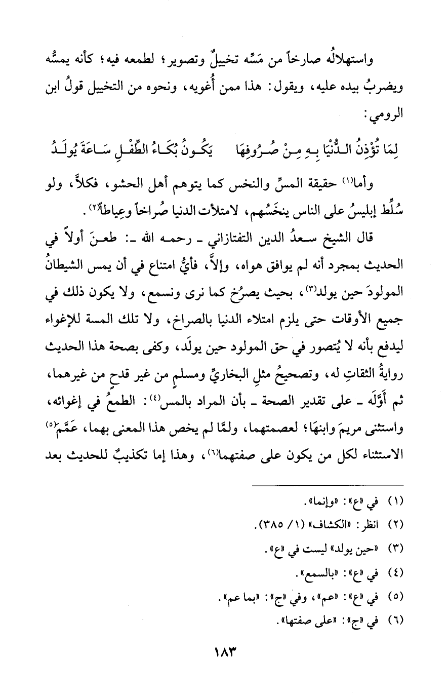 قال الشيخ سعدُ الدين التفتازاني -رحمه الله-: طعنَ أولًا في الحديث بمجرد أنه لم يوافق هواه، وإلَّا، فأيُّ امتناع في أن يمس الشيطانُ المولودَ حين يولد (¬3)، بحيث يصرُخ كما نرى ونسمع، ولا يكون ذلك في جميع الأوقات حتى يلزم امتلاء الدنيا بالصراخ، ولا تلك المسة للإغواء ليدفع بأنه لا يُتصور في حق المولود حين يولَد، وكفى بصحة هذا الحديث روايةُ الثقاتِ له، وتصحيحُ مثلِ البخاريِّ ومسلمٍ من غير قدحٍ من غيرهما، ثم أَوَّلَه -على تقدير الصحة- بأن المراد بالمس (¬4): الطمعُ في إغوائه، واستثنى مريمَ وابنهَا؛ لعصمتهما، ولمَّا لم يخص هذا المعنى بهما، عَمَّمَ (¬5) الاستثناء لكل من يكون على صفتهما (¬6)، وهذا إما تكذيبٌ للحديث بعد
