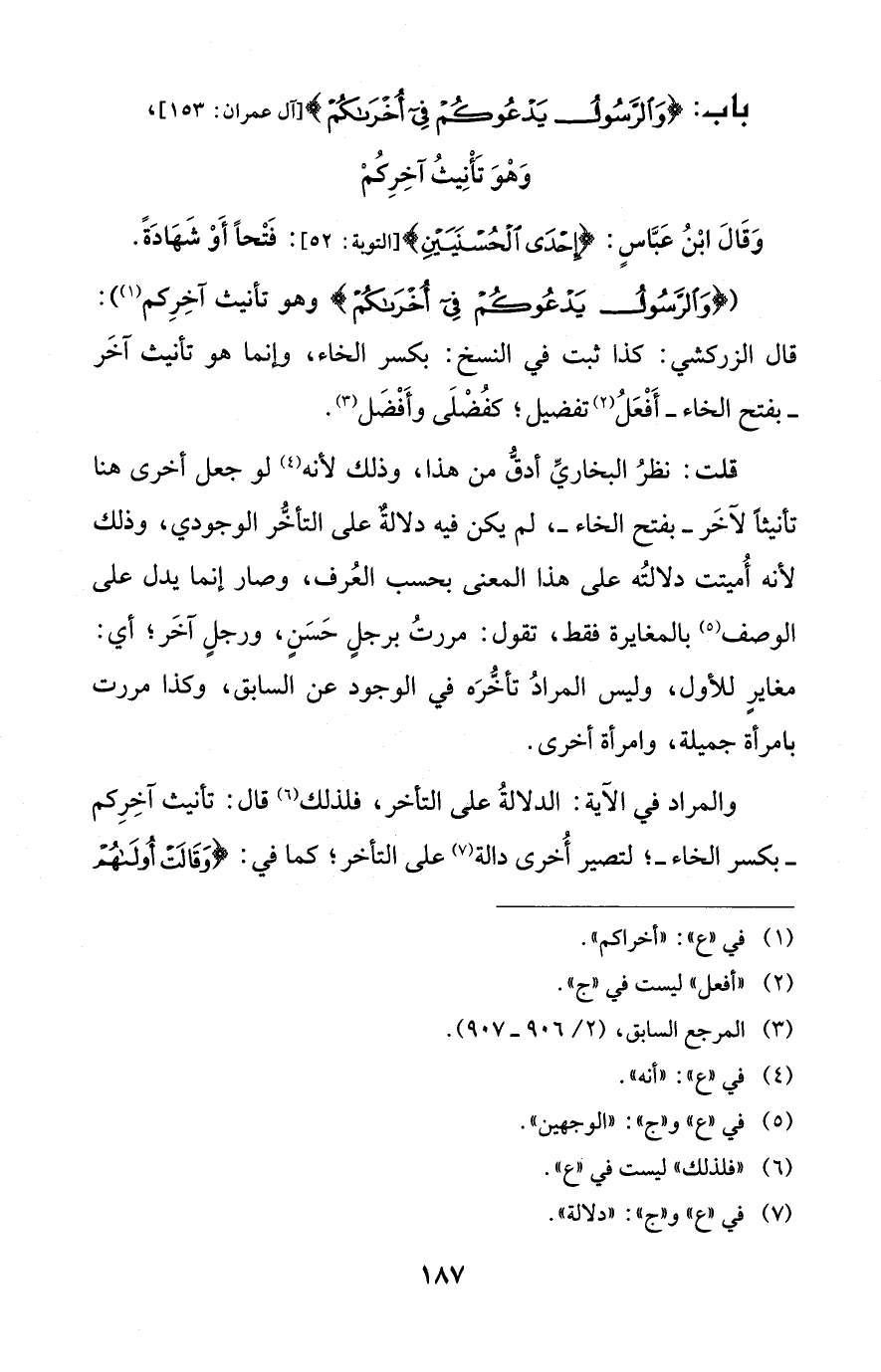 ({وَالرَّسُولُ يَدْعُوكُمْ فِي أُخْرَاكُمْ} وهو تأنيث آخِرِكم (¬1)): قال الزركشي: كذا ثبت في النسخ: بكسر الخاء، وإنما هو تأنيث آخَر -بفتح الخاء- أَفْعَلُ (¬2) تفضيل؛ كفُضْلَى وأَفْضَل (¬3).