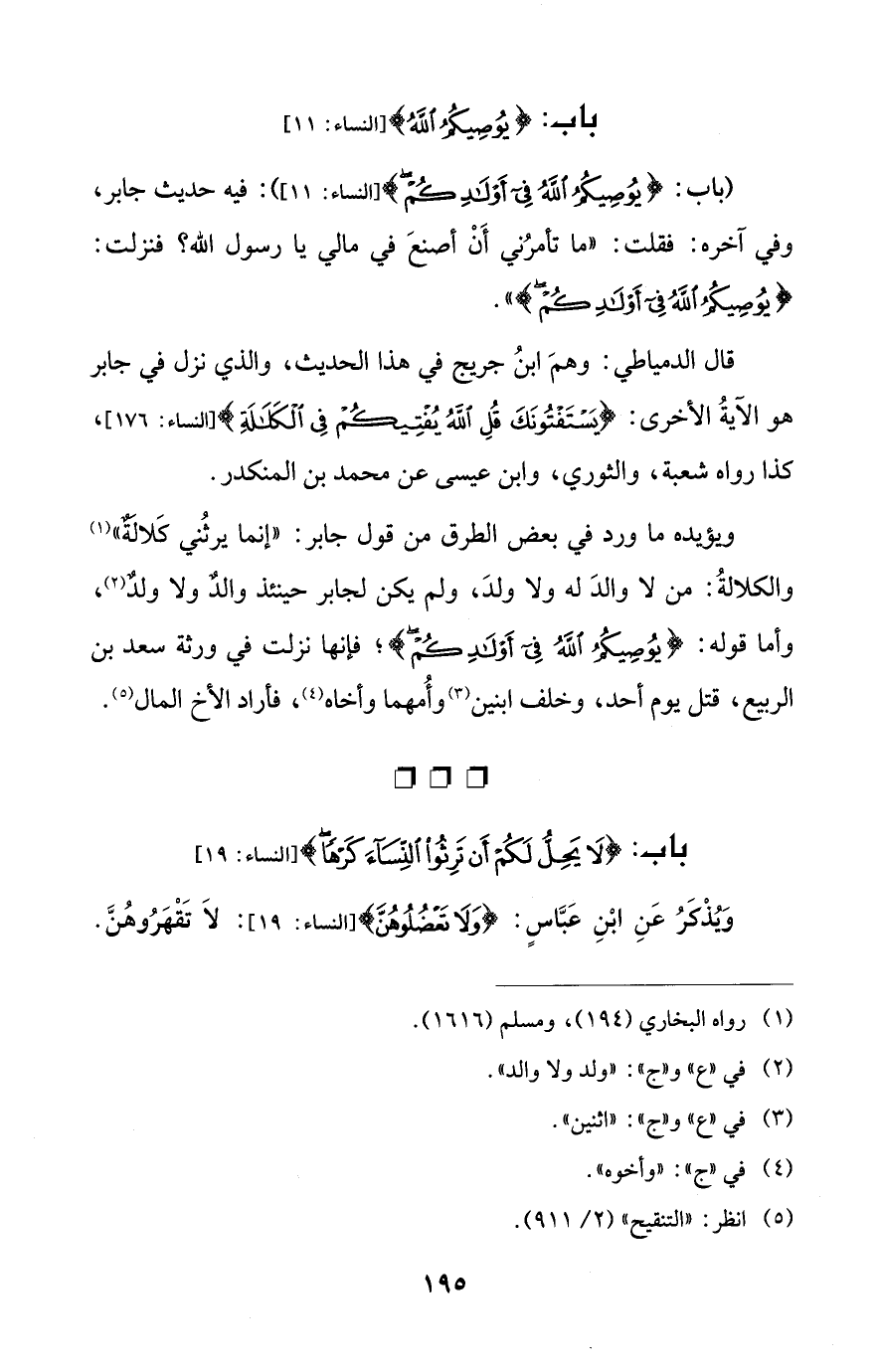 قال الدمياطي: وهمَ ابنُ جريج في هذا الحديث، والذي نزل في جابر هو الآيةُ الأخرى: {يَسْتَفْتُونَكَ قُلِ اللَّهُ يُفْتِيكُمْ فِي الْكَلَالَةِ} [النساء: 176]، كذا رواه شعبة، والثوري، وابن عيسى عن محمد بن المنكدر.