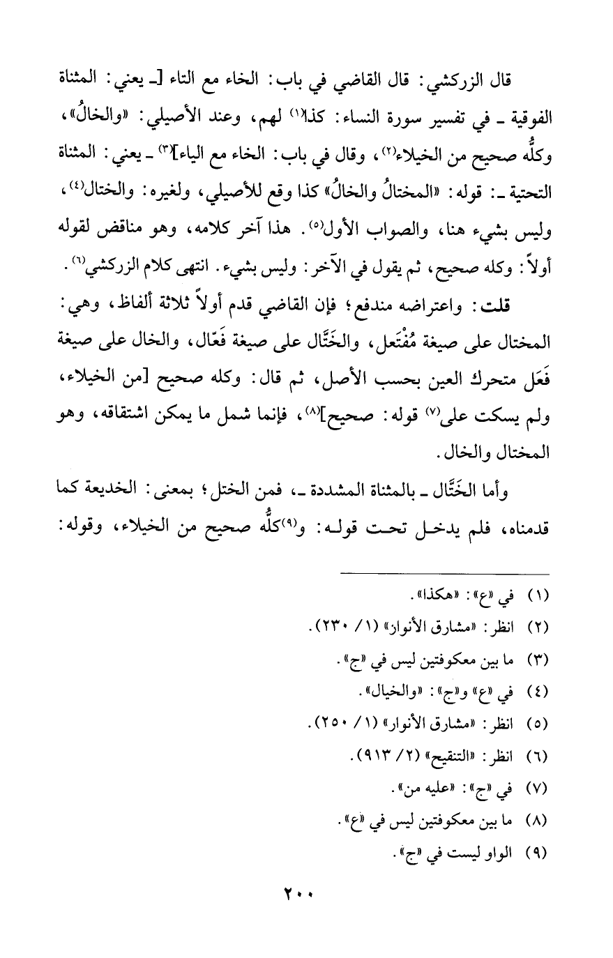 قال الزركشي: قال القاضي في باب: الخاء مع التاء [-يعني: المثناة الفوقية- في تفسير سورة النساء: كذا (¬1) لهم، وعند الأصيلي: "والخالُ"، وكلُّه صحيح من الخيلاء (¬2)، وقال في باب: الخاء مع الياء] (¬3) -يعني: المثناة التحتية-: قوله: "المختالُ والخالُ" كذا وقع للأصيلي، ولغيره: والختال (¬4)، وليس بشيء هنا، والصواب الأول (¬5). هذا آخر كلامه، وهو مناقض لقوله أولًا: وكله صحيح، ثم يقول في الآخر: وليس بشيء. انتهى كلام الزركشي (¬6).