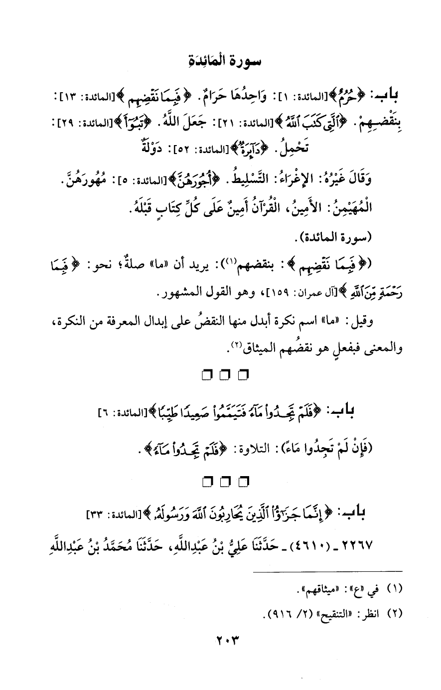 باب: {حُرُمٌ} [المائدة: 1]: وَاحِدُهَا حَرَامٌ. {فَبِمَا نَقْضِهِمْ} [المائدة: 13]: بِنَقضِهِمْ. {الَّتِي كَتَبَ اللَّهُ} [المائدة: 21]: جَعَلَ اللَّهُ. {تَبُوءَ} [المائدة: 29]: تَحْمِلُ. {دَائِرَةٌ} [المائدة: 52]: دَوْلة.
