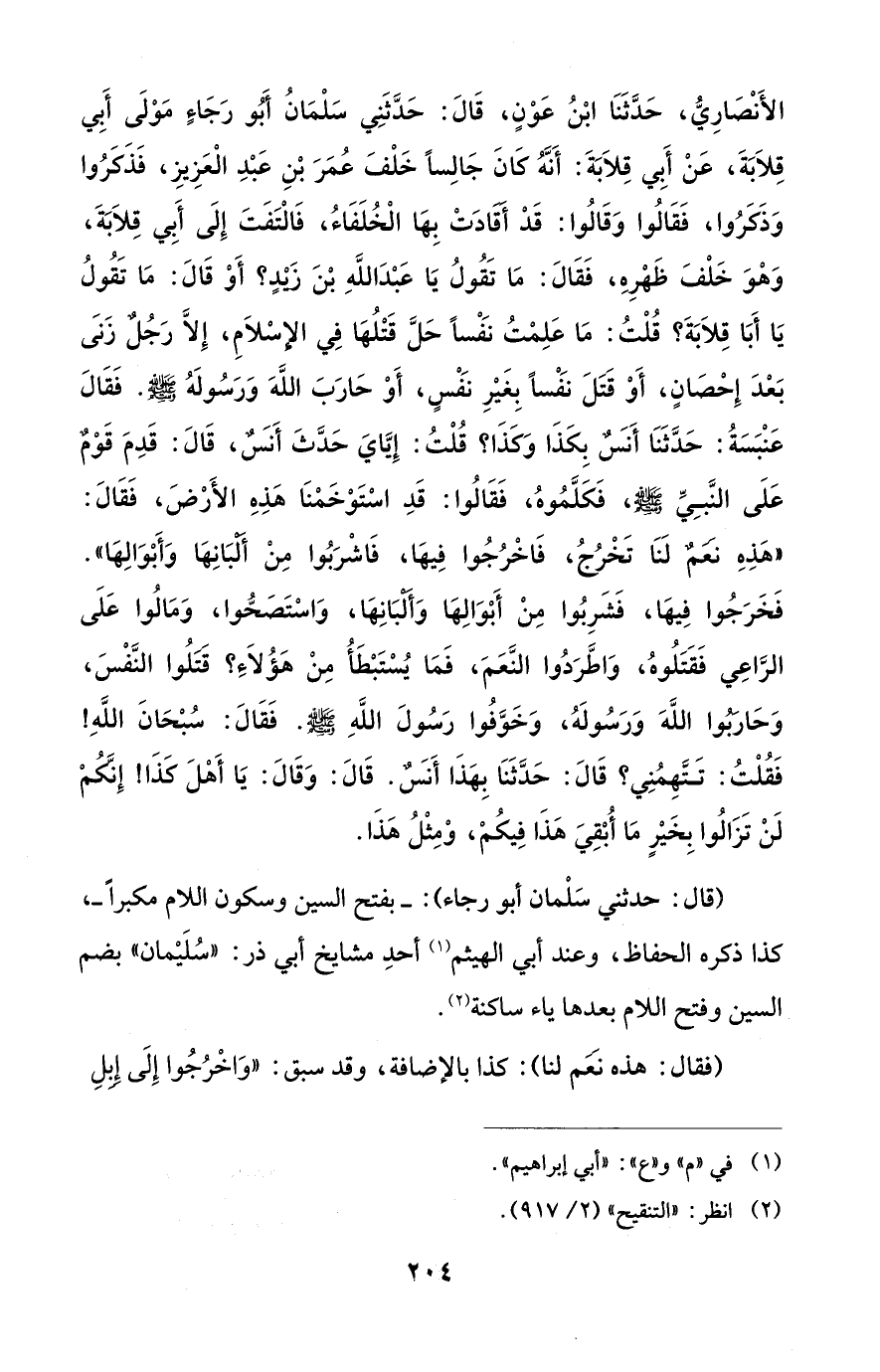 الأَنْصَارِيُّ، حَدَّثَنَا ابْنُ عَوْنٍ، قَالَ: حَدَّثَنِي سَلْمَانُ أَبُو رَجَاءٍ مَوْلَى أَبِي قِلَابَةَ، عَنْ أَبي قِلَابَةَ: أَنَّهُ كَانَ جَالِسًا خَلْفَ عُمَرَ بْنِ عَبْدِ الْعَزِيزِ، فَذَكَرُوا وَذَكَرُوا، فَقَالُوا وَقَالُوا: قَدْ أقادَتْ بِهَا الْخُلَفَاءُ، فَالْتَفَتَ إِلَى أَبِي قِلَابَةَ، وَهْوَ خَلْفَ ظَهْرِهِ، فَقَالَ: مَا تَقُولُ يَا عَبْدَ اللَّهِ بْنَ زيدٍ؟ أَوْ قَالَ: مَا تَقُولُ يَا أَبَا قِلَابَةَ؟ قُلْتُ: مَا عَلِمْتُ نَفْسًا حَل قَتْلُهَا فِي الإسْلَامِ، إِلَّا رَجُل زَنَى بَعْدَ إِحْصَانٍ، أَوْ قَتَلَ نفسًا بِغَيْرِ نَفْسٍ، أَوْ حَارَبَ اللَّهَ وَرَسُولَهُ - صلى الله عليه وسلم -. فَقَالَ عَنْبَسَةُ: حَدَّثَنَا أَنس بِكَذَا وَكَذَا؟ قُلْتُ: إِيَّايَ حَدَّثَ أَنسٌ، قَالَ: قَدِمَ قَوْمٌ عَلَى النَّبِيِّ - صلى الله عليه وسلم -، فَكَلَّمُوهُ، فَقَالُوا: قَدِ اسْتَوْخَمْنَا هَذِهِ الأَرْضَ، فَقَالَ: "هَذِهِ نعَمٌ لَنَا تَخْرُجُ، فَاخْرُجُوا فِيهَا، فَاشْرَبُوا مِنْ ألبَانِهَا وَأَبْوَالِهَا". فَخَرَجُوا فِيهَا، فَشَرِبُوا مِنْ أَبْوَالِهَا وَألبَانِهَا، وَاسْتَصَحُّوا، وَمَالُوا عَلَى الراعِي فَقَتَلُوهُ، وَاطَّرَدُوا النعَمَ، فَمَا يُسْتَبْطَأُ مِنْ هَؤُلَاءِ؟ قتَلُوا النَّفْسَ، وَحَارَبوا اللَّهَ وَرَسُولَهُ، وَخَوَّفُوا رَسُولَ اللَّهِ - صلى الله عليه وسلم -. فَقَالَ: سُبْحَانَ اللَّهِ! فَقُلْتُ: تَتَهِمُنِي؟ قَالَ: حَدَّثَنَا بِهَذَا أَنسٌ. قَالَ: وَقَالَ: يَا أَهْلَ كَذَا! إِنَكمْ لَنْ تَزَالُوا بِخَيْرٍ مَا أُبْقِيَ هَذَا فِيكُمْ، وْمِثْلُ هَذَا.