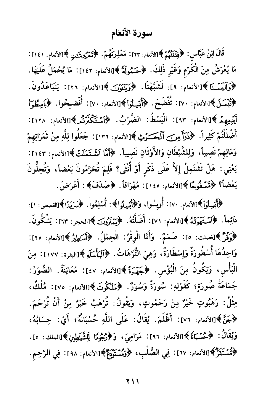{أُبْسِلُوا} [الأنعام: 70]: أُويِسُوا، وَ {أُبْسِلُوا}: أُسْلِمُوا. {سَرْمَدًا} [القصص: 71]: دائِمًا. {اسْتَهْوَتْهُ} [الأنعام: 71]: أَضَلَّتْهُ. {يَمْتَرُونَ} [الحجر: 63]: يَشُكُّونَ. {وَقْرٌ} [فصلت: 5]: صَمَم. وَأَمَّا الْوِقْرُ: الْحِمْلُ. {أَسَاطِيرُ} [الأنعام: 25]: وَاحِدُهَا أُسْطُورَة وَإِسْطَارَة، وَهِيَ التُّرَّهَاتُ. {الْبَأْسَاءِ} [البقرة: 177]: مِنَ الْبَأْسِ، وَيَكُونُ مِنَ الْبُؤْسِ. {جَهْرَةً} [الأنعام: 47]: مُعَايَنَةً. الصُّوَرُ: جَمَاعَةُ صُورَةٍ؛ كقَوْلهِ: سُورَة وَسُوَر. {مَلَكُوتَ} [الأنعام: 75]: مُلكٌ، مِثْلُ: رَهَبُوتٍ خَيْر مِنْ رَحَمُوتٍ، وَيَقُولُ: تُرْهَبُ خَيْر مِنْ أَنْ تُرْحَمَ. {جَنَّ} [الأنعام: 76]: أَظْلَمَ. يُقَالُ: عَلَى اللَّهِ حُسْبَانه؛ أَيْ: حِسَابُهُ، وَيُقَالُ: {حُسْبَانًا} [الأنعام: 96]: مَرَامِيَ، وَ {رُجُومًا لِلشَّيَاطِينِ} [الملك: 5]. {مُسْتَقَرٌّ} [الأنعام: 67]: فِي الصُّلْبِ، {وَمُسْتَوْدَعٌ} [الأنعام: 98]: فِي الرَّحِم.