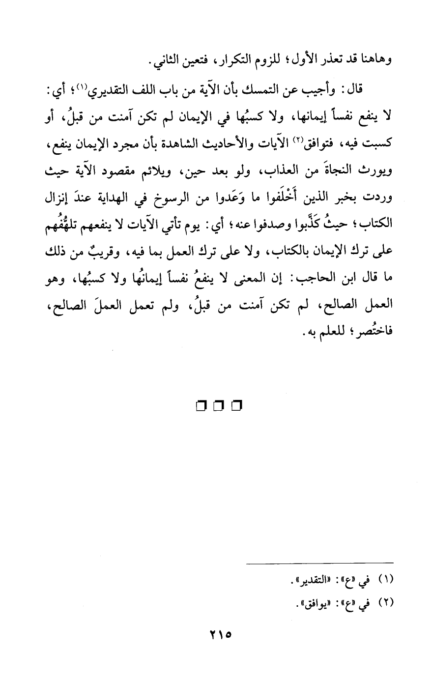قال: وأجيب عن التمسك بأن الآية من باب اللف التقديري (¬1)؛ أي: لا ينفع نفسًا إيمانها، ولا كسبُها في الإيمان لم تكن آمنت من قبلُ، أو كسبت فيه، فتوافق (¬2) الآيات والأحاديث الشاهدة بأن مجرد الإيمان ينفع، ويورث النجاةَ من العذاب، ولو بعد حين، ويلائم مقصود الآية حيث وردت بخبر الذين أَخْلَفوا ما وَعَدوا من الرسوخ في الهداية عندَ إنزال الكتاب؛ حيثُ كَذَّبوا وصدفوا عنه؛ أي: يوم تأتي الآيات لا ينفعهم تلهُّفُهم على ترك الإيمان بالكتاب، ولا على ترك العمل بما فيه، وقريبٌ من ذلك ما قال ابن الحاجب: إن المعنى لا ينفعُ نفسًا إيمانهُا ولا كسبُها، وهو العمل الصالح، لم تكن آمنت من قبلُ، ولم تعمل العملَ الصالح، فاختُصر؛ للعلم به.