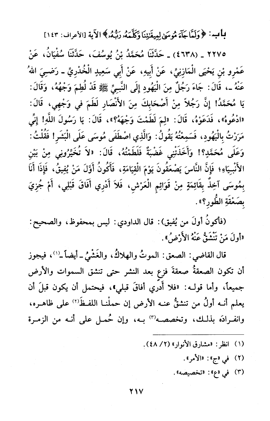 2275 - (4638) - حَدَّثَنَا مُحَمَّدُ بْنُ يُوسُفَ، حَدَّثَنَا سُفْيَانُ، عَنْ عَمْرِو بْنِ يَحْيَى الْمَازِنيِّ، عَنْ أَبيهِ، عَنْ أَبِي سَعِيدٍ الْخُدْرِيِّ - رضي الله عنه -، قَالَ: جَاءَ رَجُل مِنَ الْيَهُودِ إِلَى النَّبِيِّ - صلى الله عليه وسلم - قَدْ لُطِمَ وَجْهُهُ، وَقَالَ: يَا مُحَمَّدُ! إِنَّ رَجُلًا مِنْ أَصْحَابِكَ مِنَ الأَنْصَارِ لَطَمَ في وَجْهِي، قَالَ: "ادْعُوهُ"، فَدَعَوْهُ، قَالَ: "لِمَ لَطَمْتَ وَجْهَهُ؟ "، قَالَ: يَا رَسُولَ اللَّهِ! إِنِّي مَرَرْتُ بِالْيَهُودِ، فَسَمِعْتُهُ يَقُولُ: وَالَّذِي اصْطَفَى مُوسَى عَلَى الْبَشَرِ! فَقُلْتُ: وَعَلَى مُحَمَّدٍ؟! وَأَخَذَتْنِي غَضْبَة فَلَطَمْتُهُ، قَالَ: "لَا تُخَيِّرُوني مِنْ بَيْنِ الأَنْبِيَاءِ؛ فَإِنَّ النَّاسَ يَصْعَقُونَ يَوْمَ الْقِيَامَةِ، فَأكُونُ أَوَّلَ مَنْ يُفِيقُ، فَإِذَا أَنَا بِمُوسَى آخِذ بِقَائِمَةٍ مِنْ قَوَائِم الْعَرْشِ، فَلَا أَدْرِي أفاقَ قَبْلِي، أَمْ جُزِيَ بِصَعْقَةِ الطُّورِ؟ ".