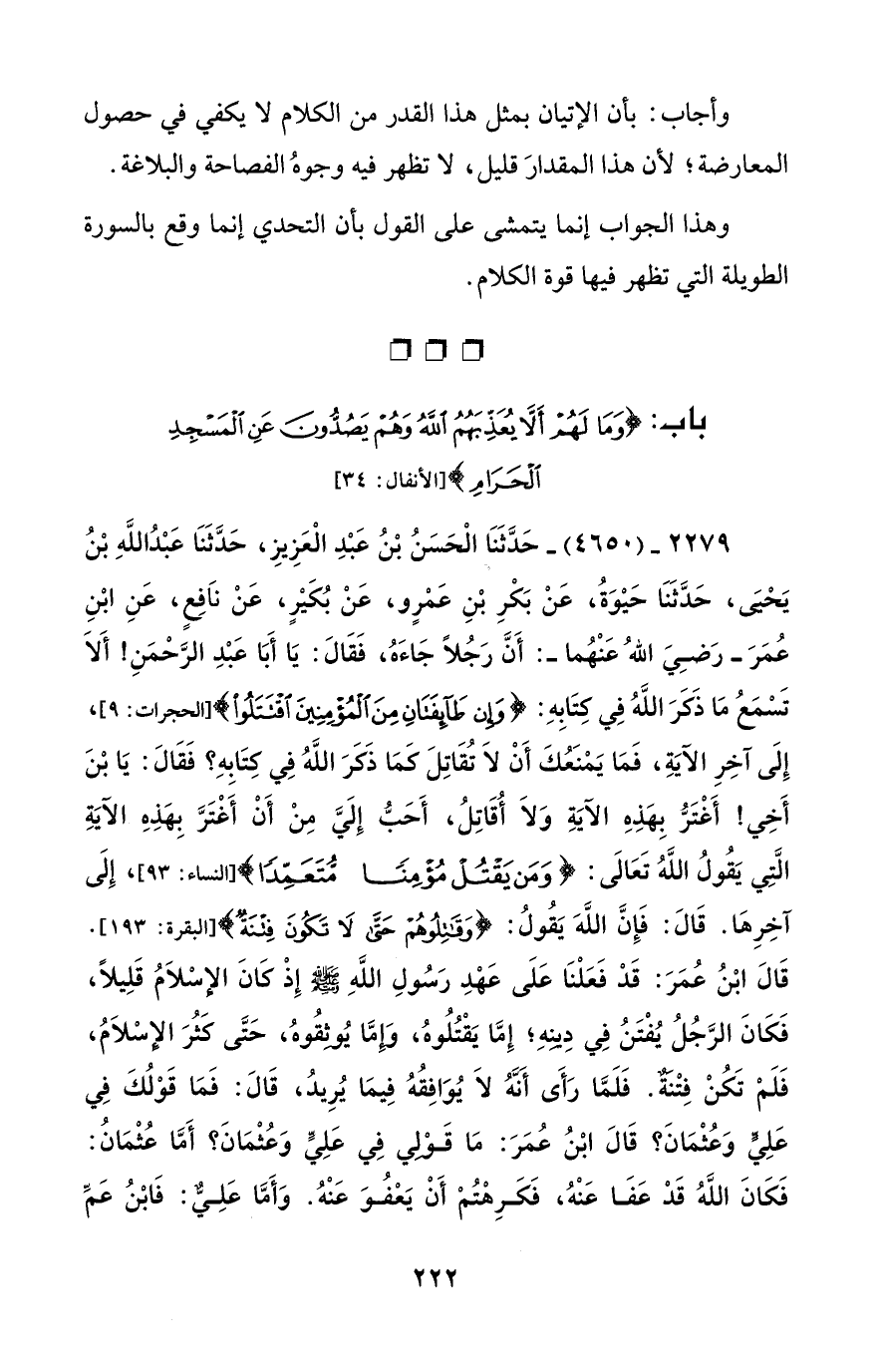2279 - (4650) - حَدَّثَنَا الْحَسَنُ بْنُ عَبْدِ الْعَزِيزِ، حَدَّثَنَا عَبْدُ اللَّهِ بْنُ يَحْيى، حَدَّثَنَا حَيْوَةُ، عَنْ بَكْرِ بْنِ عَمْرٍو، عَنْ بُكَيْرٍ، عَنْ نَافِعٍ، عَنِ ابْنِ عُمَرَ -رَضِيَ اللهُ عَنْهُما-: أَنَّ رَجُلًا جَاءَهُ، فَقَالَ: يَا أَبَا عَبْدِ الرَّحْمَنِ! أَلَا تَسْمَعُ مَا ذَكَرَ اللَّهُ فِي كتَابِهِ: {وَإِنْ طَائِفَتَانِ مِنَ الْمُؤْمِنِينَ اقْتَتَلُوا} [الحجرات: 9]، إِلَى آخِرِ الآيَةِ، فَمَا يَمْنَعُكَ أَنْ لَا تُقَاتِلَ كَمَا ذَكرَ اللَّهُ فِي كتَابِهِ؟ فَقَالَ: يَا بْنَ أَخِي! أَغْتَرُّ بِهَذِهِ الآيَةِ وَلَا أُقَاتِلُ، أَحَبُّ إِلَيَّ مِن أَنْ أَغتَرَّ بِهَذِهِ الآيَةِ الَّتِي يَقُولُ اللَّهُ تَعَالَى: {وَمَنْ يَقْتُلْ مُؤْمِنًا مُتَعَمِّدًا} [النساء: 93]، إِلَى آخِرِهَا. قَالَ: فَإِنَّ اللَّهَ يَقُولُ: {وَقَاتِلُوهُمْ حَتَّى لَا تَكُونَ فِتْنَةٌ} [البقرة: 193]. قَالَ ابْنُ عُمَرَ: قَدْ فَعَلْنَا عَلَى عَهْدِ رَسُولِ اللَّهِ - صلى الله عليه وسلم - إِذْ كَانَ الإسْلَامُ قَلِيلًا، فَكَانَ الرَّجُلُ يُفْتَنُ فِي دِينهِ؛ إِمَّا يَقْتُلُوهُ، وَإِمَّا يُوثقُوهُ، حَتَى كَثُرَ الإسْلَامُ، فَلَمْ تَكُنْ فِتْنةٌ. فَلَمَّا رَأَى أَنهُ لَا يُوَافِقُهُ فِيمَا يُرِيدُ، قَالَ: فَمَا قَوْلُكَ فِي عَلِيٍّ وَعُثْمَانَ؟ قَالَ ابْنُ عُمَرَ: مَا قَوْلي فِي عَلِيِّ وَعُثْمَانَ؟ أَمَّا عُثْمَانُ: فَكَانَ اللهُ قَدْ عَفَا عَنْهُ، فَكَرِهْتُمْ أَنْ يَعْفُوَ عَنْهُ. وَأَمَّا عَلِيٌّ: فَابْنُ عَمِّ
