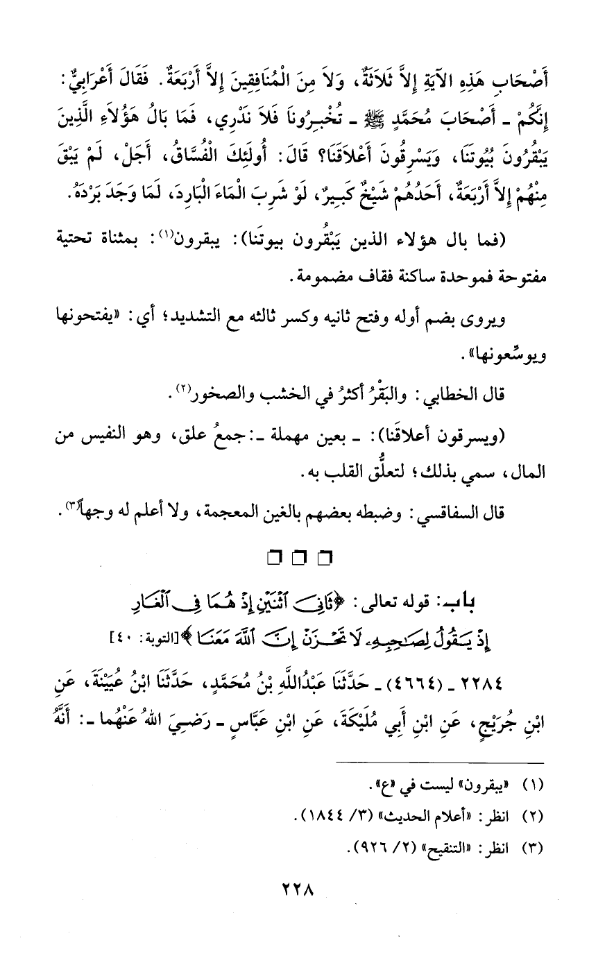 أَصْحَابِ هَذه الآيَةِ إِلَّا ثَلَاثة، وَلَا مِنَ الْمُنَافِقِينَ إِلَّا أَرْبَعَةٌ. فَقَالَ أَعْرَابِيٌّ: إِنَّكمْ -أَصحَابَ مُحَمَّدٍ - صلى الله عليه وسلم -- تُخْبِرُونَا فَلَا نَدْرِي، فَمَا بَالُ هَؤُلَاء الَّذِينَ يَبْقُرُونَ بُيُوتَنَا، وَيَسْرِقُونَ أَعْلَاقَنَا؟ قَالَ: أُولَئِكَ الْفُسَّاقُ، أَجَلْ، لَمْ يَبْقَ مِنْهُمْ إِلَّا أَرْبَعَةٌ، أَحَدُهُمْ شَيْخٌ كَبِيرٌ، لَوْ شَرِبَ الْمَاءَ الْبَارِدَ، لَمَا وَجَدَ بَرْدَهُ.