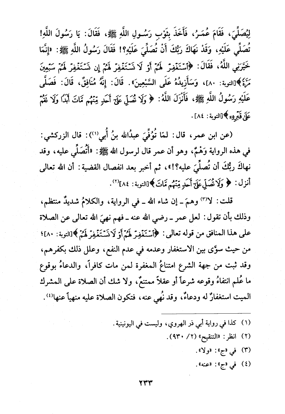 (عن ابن عمر، قال: لمّا تُوُفِّيَ عبدُ الله بنُ أُبي (¬1)): قال الزركشي: في هذه الرواية وَهْمٌ، وهو أن عمر قال لرسول الله - صلى الله عليه وسلم -: "أتصَلِّي عليه، وقد نهاكَ ربُّك أن تُصلِّيَ عليه؟! "، ثم أخبر بعد انفصال القضية: أن الله تعالى أنزل: {وَلَا تُصَلِّ عَلَى أَحَدٍ مِنْهُمْ مَاتَ} [التوبة: 84] (¬2).