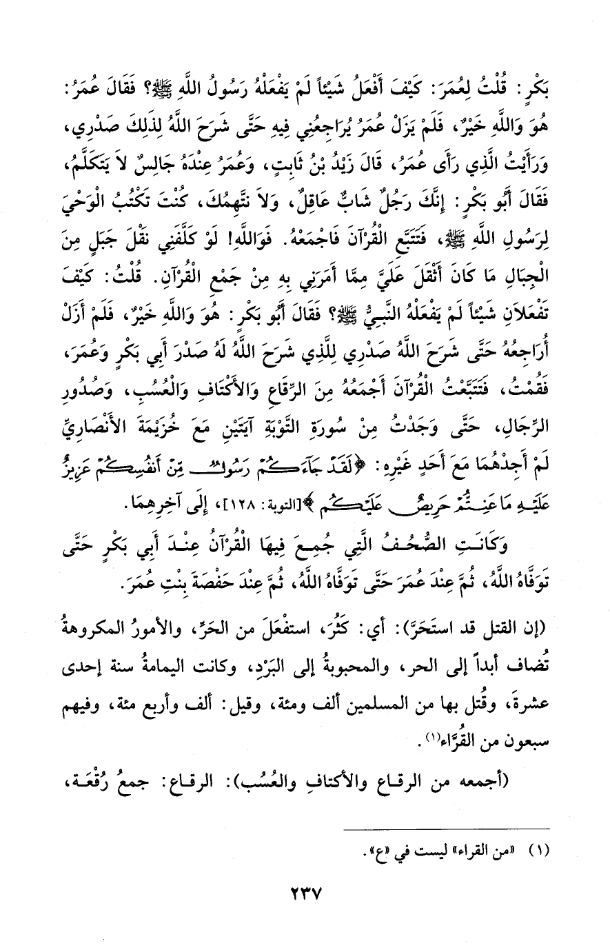 بَكْرٍ: قُلْتُ لِعُمَرَ: كَيْفَ أَفْعَلُ شَيْئًا لَمْ يَفْعَلْهُ رَسُولُ اللَّهِ - صلى الله عليه وسلم -؟ فَقَالَ عُمَرُ: هُوَ وَاللَّهِ خَيْرٌ، فَلَمْ يَزَلْ عُمَرُ يُرَاجِعُنِي فِيهِ حَتَّى شَرَحَ اللَّهُ لِذَلِكَ صَدْرِي، وَرَأَيْتُ الَّذِي رَأَى عُمَرُ، قَالَ زيدُ بْنُ ثَابِتٍ، وَعُمَرُ عِنْدَهُ جَالِسٌ لَا يَتَكَلَّمُ، فَقَالَ أَبُو بَكْرٍ: إِنَّكَ رَجُل شَابٌّ عَاقِل، وَلَا نتَّهِمُكَ، كُنْتَ تَكْتُبُ الْوَحْيَ لِرَسُولِ اللَّهِ - صلى الله عليه وسلم -، فتتَبَّعِ الْقُرْآنَ فَاجْمَعْهُ. فَوَاللَّهِ! لَوْ كلَّفَنِي نقلَ جَبَلٍ مِنَ الْحِبَالِ مَا كَانَ أَثْقَلَ عَلَيَّ مِمَّا أَمَرَنِي بِهِ مِنْ جَمْعِ الْقُرْآنِ. قُلْتُ: كَيْفَ تَفْعَلَانِ شَيْئًا لَمْ يَفْعَلْهُ النَّبِيُّ - صلى الله عليه وسلم -؟ فَقَالَ أَبُو بَكْرٍ: هُوَ وَاللَّهِ خَيْر، فَلَمْ أَزَلْ أُرَاجِعُهُ حَتَّى شَرح اللَّهُ صَدْرِي لِلَّذِي شَرح اللَّهُ لَهُ صَدْرَ أَبي بَكْرٍ وَعُمَرَ، فَقُمْتُ، فتتَبَّعْتُ الْقُرْآنَ أَجْمَعُهُ مِنَ الرِّقَاعِ وَالأكتَافِ وَالْعُسُبِ، وَصُدُورِ الرِّجَالِ، حَتَّى وَجَدْتُ مِنْ سُورَةِ التَّوْبَةِ آيَتَيْنِ مَعَ خُزَيْمَةَ الأَنْصَارِيِّ لَمْ أَجِدْهُمَا مَعَ أَحَدٍ غَيْرِهِ: {لَقَدْ جَاءَكُمْ رَسُولٌ مِنْ أَنْفُسِكُمْ عَزِيزٌ عَلَيْهِ مَاعَنِتُّمْ حَرِيصٌ عَلَيْكُمْ} [التوبة: 128]، إِلَى آخِرِهِمَا.