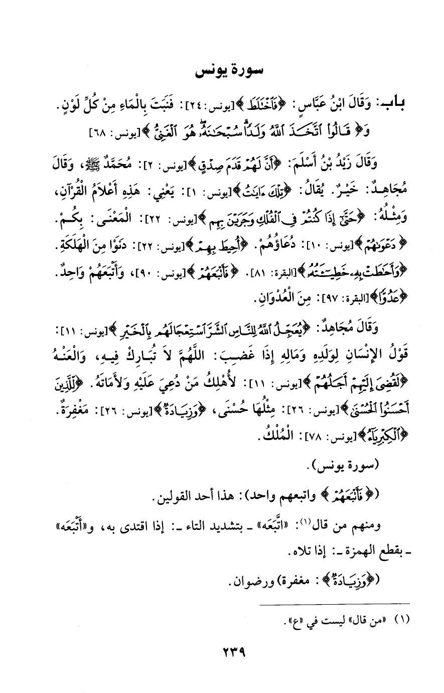 وَقَالَ زيدُ بْنُ أَسْلَمَ: {أَنَّ لَهُمْ قَدَمَ صِدْقٍ} [يونس: 2]: مُحَمَّد - صلى الله عليه وسلم -، وَقَالَ مُجَاهِد: خَيْر. يُقَالُ: {تِلْكَ آيَاتُ} [يونس: 1]: يَعْنِي: هَذه أَعْلَامُ الْقُرْآنِ، وَمِثْلُهُ: {حَتَّى إِذَا كُنْتُمْ فِي الْفُلْكِ وَجَرَيْنَ بِهِمْ} [يونس: 22]: الْمَعْنَى: بِكُمْ. {دَعْوَاهُمْ} [يونس: 10]: دُعَاؤُهُمْ. {أُحِيطَ بِهِمْ} [يونس: 22]: دنوا مِنَ الْهَلَكَةِ. {وَأَحَاطَتْ بِهِ خَطِيئَتُهُ} [البقرة: 81]. {فَأَتْبَعَهُمْ} [يونس: 90]، وَأتبَعَهُمْ وَاحِد. {عَدُوًّا} [البقرة: 97]: مِنَ الْعُدْوَانِ.