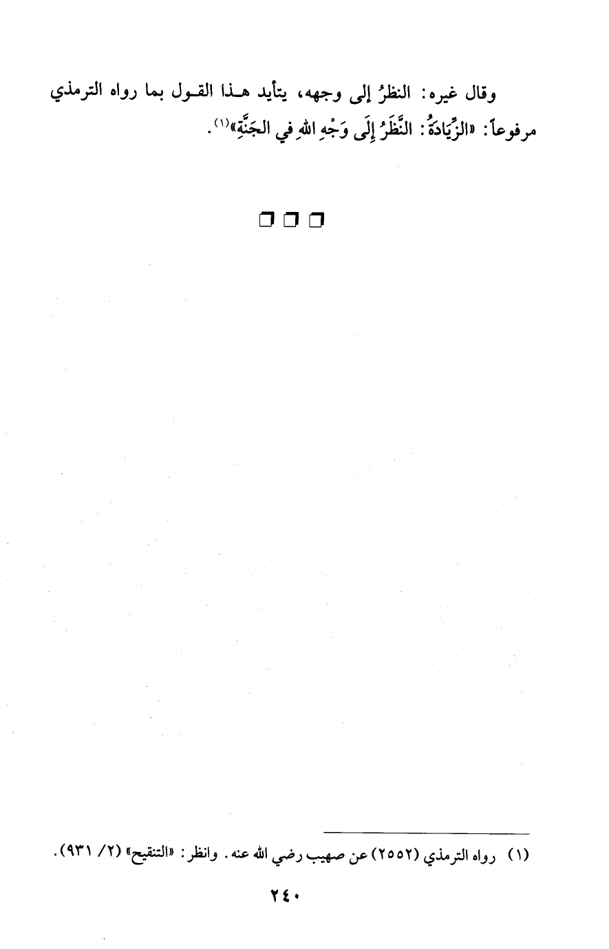وقال غيره: النظرُ إلى وجهه، يتأيد هذا القول بما رواه الترمذي مرفوعا: "الزيادة: النظَرُ إِلَى وَجْهِ اللهِ في الجَنَّةِ" (¬1).