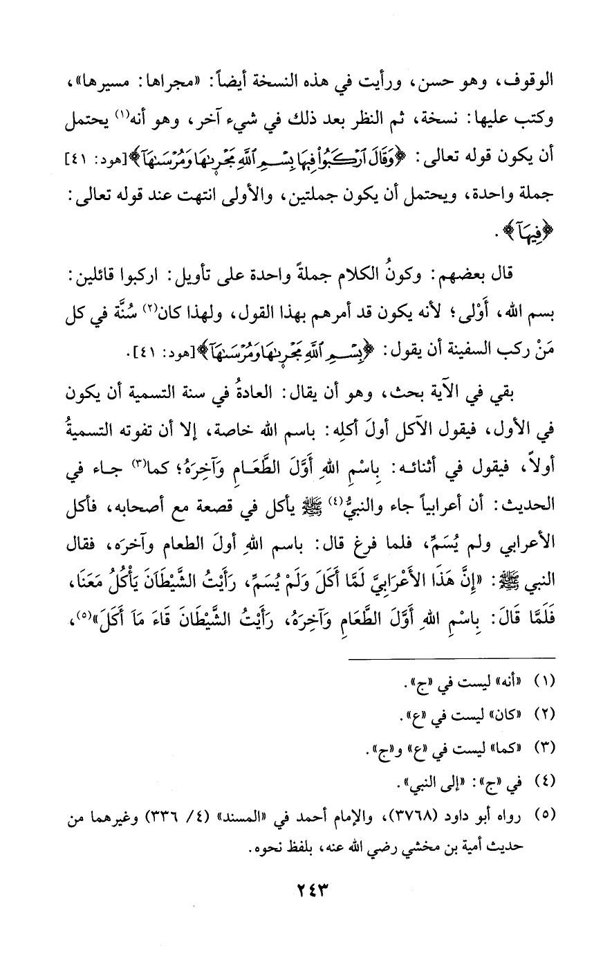 الوقوف، وهو حسن، ورأيت في هذه النسخة أيضًا: "مجراها: مسيرها"، وكتب عليها: نسخة، ثم النظر بعد ذلك في شيء آخر، وهو أنه (¬1) يحتمل أن يكون قوله تعالى: {وَقَالَ ارْكَبُوا فِيهَا بِسْمِ اللَّهِ مَجْرَاهَا وَمُرْسَاهَا} [هود: 41] جملة واحدة، ويحتمل أن يكون جملتين، والأولى انتهت عند قوله تعالى: {فِيهَا}.