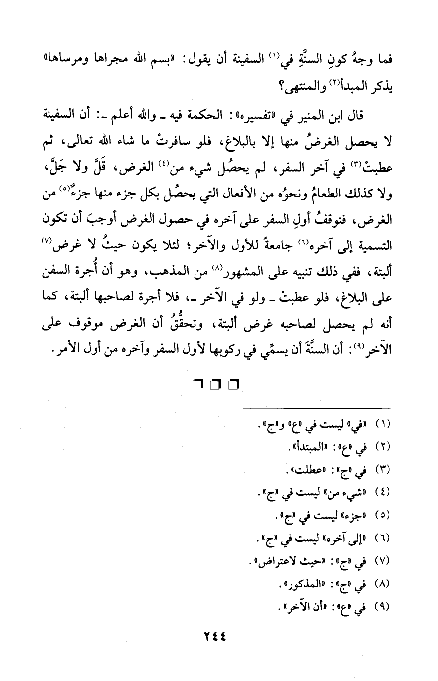 قال ابن المنير في "تفسيره": الحكمة فيه -والله أعلم-: أن السفينة لا يحصل الغرضُ منها إلا بالبلاغ، فلو سافرت ما شاء الله تعالى، ثم عطبتْ (¬3) في آخر السفر، لم يحصُل شيء من (¬4) الغرض، قَلَّ ولا جَلَّ، ولا كذلك الطعامُ ونحوُه من الأفعال التي يحصُل بكل جزء منها جزءٌ (¬5) من الغرض، فتوقفُ أولِ السفر على آخره في حصول الغرض أوجبَ أن تكون التسمية إلى آخره (¬6) جامعة للأول والآخر؛ لئلا يكون حيثُ لا غرض (¬7) ألبتة، ففي ذلك تنبيه على المشهور (¬8) من المذهب، وهو أن أُجرة السفن على البلاغ، فلو عطبتْ -ولو في الآخر-، فلا أجرة لصاحبها ألبتة، كما أنه لم يحصل لصاحبه غرض ألبتة، وتحقُّقُ أن الغرض موقوف على الآخر (¬9): أن السنَّةَ أن يسمِّي في ركوبها لأول السفر وآخره من أول الأمر.