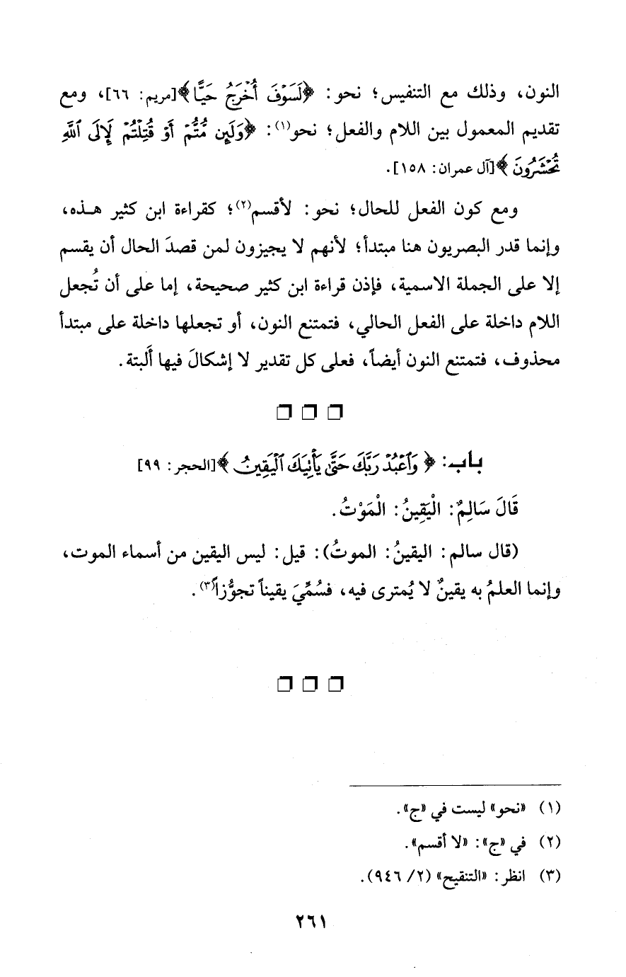 ومع كون الفعل للحال؛ نحو: لأقسم (¬2)؛ كقراءة ابن كثير هذه، وإنما قدر البصريون هنا مبتدأ؛ لأنهم لا يجيزون لمن قصدَ الحال أن يقسم إلا على الجملة الاسمية، فإذن قراءة ابن كثير صحيحة، إما على أن تُجعل اللام داخلة على الفعل الحالي، فتمتنع النون، أو تجعلها داخلة على مبتدأ محذوف، فتمتنع النون أيضًا، فعلى كل تقدير لا إشكالَ فيها أَلبتة.