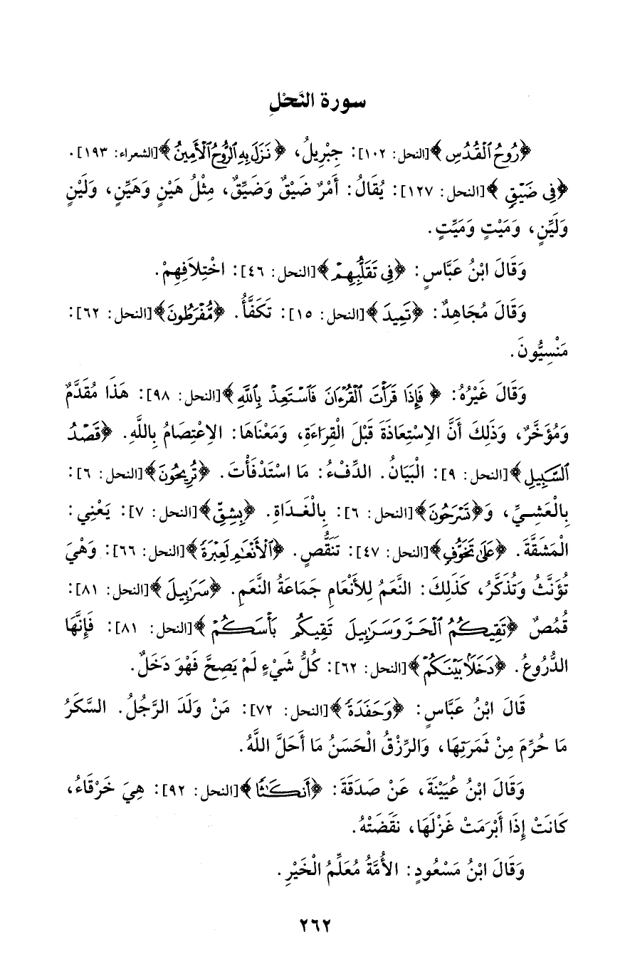 وَقَالَ غَيْرُهُ: {فَإِذَا قَرَأْتَ الْقُرْآنَ فَاسْتَعِذْ بِاللَّهِ} [النحل: 98]: هَذَا مُقَدَّمٌ وَمُؤَخَّر، وَذَلِكَ أَنَّ الاِسْتِعَاذَةَ قَبْلَ الْقِراءَةِ، وَمَعْنَاهَا: الاِعْتِصَامُ بِاللَّهِ. {قَصْدُ السَّبِيلِ} [النحل: 9]: الْبَيَانُ. الدِّفْءُ: مَا اسْتَدْفَأْتَ. {تُرِيحُونَ} [النحل: 6]: بِالْعَشِيِّ، وَ {تَسْرَحُونَ} [النحل: 6]: بِالْغَدَاةِ. {بِشِقِّ} [النحل: 7]: يَعْنِي: الْمَشَقَّةَ. {عَلَى تَخَوُّفٍ} [النحل: 47]: تَنَقُّصٍ. {الْأَنْعَامِ لَعِبْرَةً} [النحل: 66]: وَهيَ تُؤَنَّثُ وَتُذَكَّرُ، كَذَلِكَ: النَّعَمُ لِلأَنْعَامِ جَمَاعَةُ النَّعَم. {سَرَابِيلَ} [النحل: 81]: قُمُص {تَقِيكُمُ الْحَرَّ وَسَرَابِيلَ تَقِيكُمْ بَأْسَكُمْ} [النحل: 81]: فَإِنَّهَا الدُّرُوعُ. {دَخَلًا بَيْنَكُمْ} [النحل: 92]: كُلُّ شَيْءٍ لَمْ يَصِحَّ فَهْوَ دَخَل.