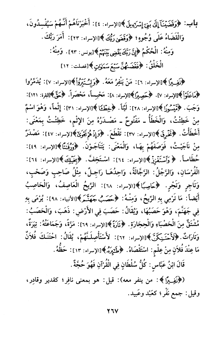 {نَفِيرًا} [الإسراء: 6]: مَنْ يَنْفِرُ مَعَهُ. {وَلِيُتَبِّرُوا} [الإسراء: 7]: يُدَمِّرُوا {مَا عَلَوْا} [الإسراء: 7]. {حَصِيرًا} [الإسراء: 8]: مَحْبِسًا، مَحْصَرًا. {حَقَّ} [البقرة: 121]: وَجَبَ. {مَيْسُورًا} [الإسراء: 28]: لَيِّنًا. {خِطْئًا} [الإسراء: 31]: إِثْمًا، وَهْوَ اسْمٌ مِنْ خَطِئْتُ، وَالْخَطَأُ -مَفْتُوحٌ- مَصْدَرُهُ مِنَ الإثْمِ، خَطِئْتُ بِمَعْنَى: أَخْطَأْتُ. {تَخْرِقَ} [الإسراء: 37]: تَقْطَعَ. {وَإِذْ هُمْ نَجْوَى} [الإسراء: 47]: مَصْدَرٌ مِنْ نَاجَيْتُ، فَوَصَفَهُمْ بِهَا، وَالْمَعْنَى: يتَنَاجَوْنَ. {وَرُفَاتًا} [الإسراء:49]: حُطَامًا. {وَاسْتَفْزِزْ} [الإسراء: 64]: اسْتَخِفَّ. {بِخَيْلِكَ} [الإسراء: 64]: الْفُرْسَانِ، وَالرَّجْلُ: الرَّجَّالَةُ، وَاحِدُهَا رَاجِلٌ، مِثْلُ صَاحِبٍ وَصَحْبٍ، وَتَاجِرٍ وَتَجْرٍ. {حَاصِبًا} [الإسراء: 68]: الرِّيحُ الْعَاصِفُ، وَالْحَاصِبُ أَيْضًا: مَا تَرْمِي بِهِ الرِّيحُ، وَمِنْهُ: {حَصَبُ جَهَنَّمَ} [الأنبياء: 98]: يُرْمَى بِهِ فِي جَهَنَّمَ، وَهْوَ حَصَبُهَا، وَيُقَالُ: حَصَبَ فِي الأَرْضِ: ذَهَبَ، وَالْحَصَبُ: مُشْتَقٌّ مِنَ الْحَصْبَاءَ وَالْحِجَارَةِ. {تَارَةً} [الإسراء: 69]: مَرَّةً، وَجَمَاعَتُهُ: تِيَرَةٌ، وَتَارَاتٌ. {لَأَحْتَنِكَنَّ} [الإسراء: 62]: لأَسْتَأْصِلَنَّهُمْ، يُقَالُ: احْتَنَكَ فُلَانٌ مَا عِنْدَ فُلَانٍ مِنْ عِلْمٍ: اسْتَقْصَاهُ. {طَائِرَهُ} [الإسراء: 13]: حَظُّهُ.