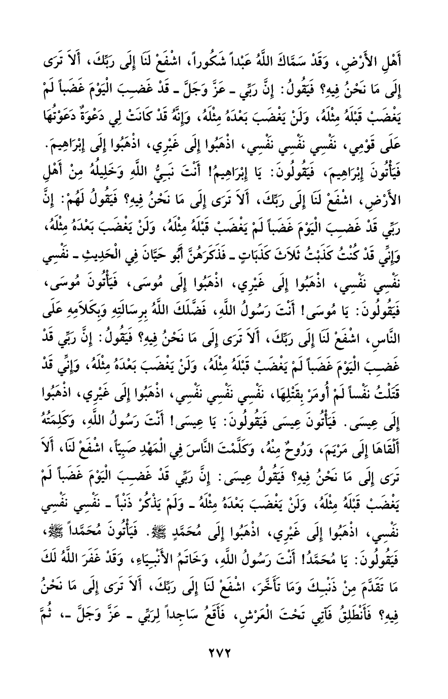 أَهْلِ الأَرْضِ، وَقَدْ سَمَّاكَ اللَّهُ عَبْدًا شَكُورًا، اشْفَعْ لَنَا إِلَى رَبِّكَ، أَلَا تَرَى إِلَى مَا نَحْنُ فِيهِ؟ فَيَقُولُ: إِنَّ رَبِّي -عَزَّ وَجَلَّ- قَدْ غَضِبَ الْيَوْمَ غَضَبًا لَمْ يَغْضَبْ قَبْلَهُ مِثْلَهُ، وَلَنْ يَغْضَبَ بَعْدَهُ مِثْلَهُ، وَإِنَّهُ قَدْ كَانَتْ لِي دَعْوَةٌ دَعَوْتُهَا عَلَى قَوْمِي، نَفْسِي نَفْسِي نَفْسِي، اذْهَبُوا إِلَى غَيْرِي، اذْهَبُوا إِلَى إِبْرَاهِيمَ. فَيَأْتُونَ إِبْرَاهِيمَ، فَيَقُولُونَ: يَا إِبْرَاهِيمُ! أَنْتَ نبَيُّ اللَّهِ وَخَلِيلُهُ مِنْ أَهْلِ الأَرْضِ، اشْفَعْ لَنَا إِلَى رَبِّكَ، أَلَا تَرَى إِلَى مَا نَحْنُ فِيهِ؟ فَيَقُولُ لَهُمْ: إِنَّ رَبِّي قَدْ غَضِبَ الْيَوْمَ غَضَبًا لَمْ يَغْضَبْ قَبْلَهُ مِثْلَهُ، وَلَنْ يَغْضَبَ بَعْدَهُ مِثْلَهُ، وَإِنِّي قَدْ كُنْتُ كَذَبْتُ ثَلَاثَ كَذَبَاتٍ -فَذَكَرَهُنَّ أَبُو حَيَّانَ فِي الْحَدِيثِ- نَفْسِي نَفْسِي نَفْسِي، اذْهَبُوا إِلَى غَيْرِي، اذْهَبُوا إِلَى مُوسَى، فَيَأْتُونَ مُوسَى، فَيَقُولُونَ: يَا مُوسَى! أَنْتَ رَسُولُ اللهِ، فَضلَكَ اللَّهُ بِرِسَالَتِهِ وَبِكَلَامِهِ عَلَى النَّاسِ، اشْفَعْ لَنَا إِلَى رَبِّكَ، أَلَا تَرَى إِلَى مَا نَحْنُ فِيهِ؟ فَيَقُولُ: إِنَّ رَبِّي قَدْ غَضِبَ الْيَوْمَ غَضَبًا لَمْ يَغْضَبْ قَبْلَهُ مِثْلَهُ، وَلَنْ يَغْضَبَ بَعْدَهُ مِثْلَهُ، وَإِنِّي قَدْ قتلْتُ نَفْسًا لَمْ أُومَرْ بِقَتْلِهَا، نَفْسِي نَفْسِي نفسِي، اذْهَبُوا إِلَى غَيْرِي، اذْهَبُوا إِلَى عِيسَى. فَيَأْتُونَ عِيسَى فَيَقُولُونَ: يَا عِيسَى! أَنْتَ رَسُولُ اللَّهِ، وَكَلِمَتُهُ ألقَاهَا إِلَى مَرْيَمَ، وَرُوحٌ مِنْهُ، وَكَلَّمْتَ النَّاسَ فِي الْمَهْدِ صَبِيًّا، اشْفَعْ لنا، أَلَا تَرَى إِلَى مَا نَحْنُ فِيهِ؟ فَيَقُولُ عِيسَى: إِنَّ رَبِّي قَدْ غَضِبَ الْيَوْمَ غَضَبًا لَمْ يَغْضَبْ قَبْلَهُ مِثْلَهُ، وَلَنْ يَغْضَبَ بَعْدَهُ مِثْلَهُ -وَلَمْ يَذْكُرْ ذَنْبًا- نَفْسِي نَفْسِي نَفْسِي، اذْهَبُوا إِلَى غَيْرِي، اذْهَبُوا إِلَى مُحَمَّدٍ - صلى الله عليه وسلم -. فَيَأْتُونَ مُحَمَّدًا - صلى الله عليه وسلم -، فَيَقُولُونَ: يَا مُحَمَّدُ! أَنْتَ رَسُولُ اللَّهِ، وَخَاتَمُ الأَنْبِيَاءِ، وَقَدْ غَفَرَ اللَّهُ لَكَ مَا تَقَدَّمَ مِنْ ذَنْبِكَ وَمَا تَأَخَّرَ، اشْفَعْ لَنَا إِلَى رَبِّكَ، أَلَا تَرَى إِلَى مَا نَحْنُ فِيهِ؟ فَأَنْطَلِقُ فَآتِي تَحْتَ الْعَرْشِ، فَأَقَعُ سَاجِدًا لِرَبِّي -عَزَّ وَجَلَّ-، ثُمَّ