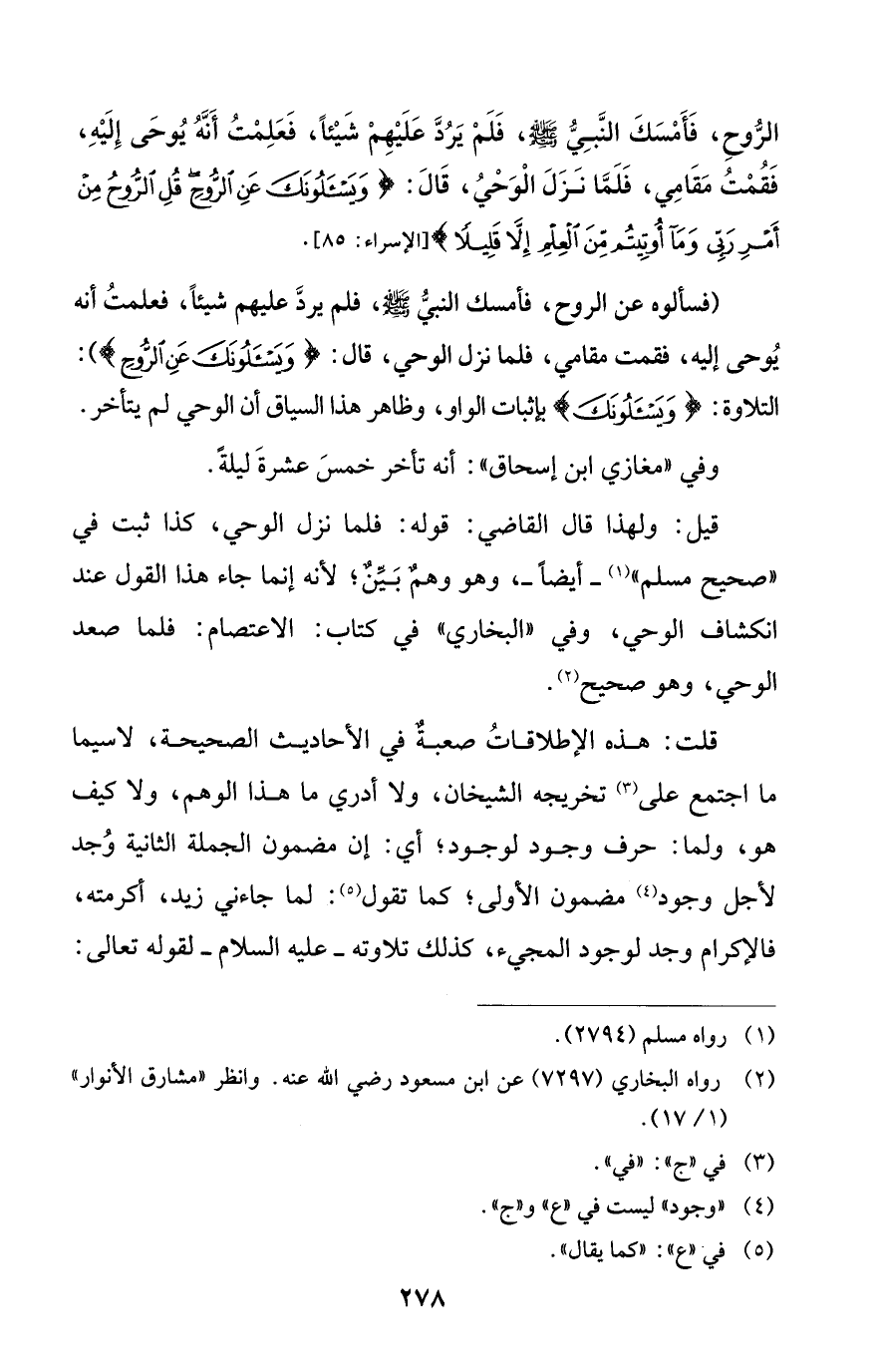 (فسألوه عن الروح، فأمسك النبيُّ - صلى الله عليه وسلم -، فلم يردَّ عليهم شيئًا، فعلمتُ أنه يُوحى إليه، فقمت مقامي، فلما نزل الوحي، قال: {وَيَسْأَلُونَكَ عَنِ الرُّوحِ}): التلاوة: {وَيَسْأَلُونَكَ} بإثبات الواو، وظاهر هذا السياق أن الوحي لم يتأخر.