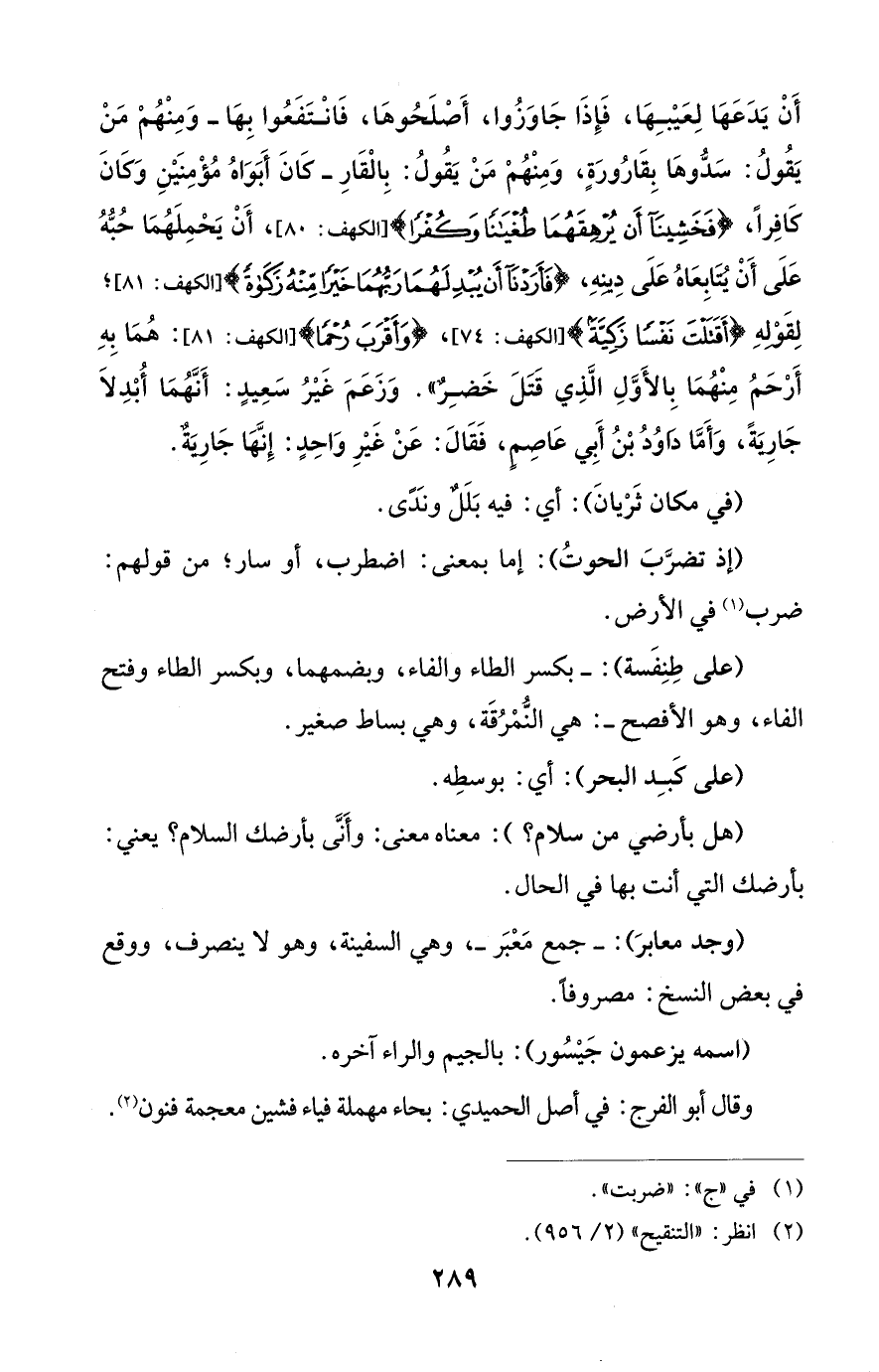 أَنْ يَدَعَهَا لِعَيْبِهَا، فَإِذَا جَاوَزُوا، أَصْلَحُوهَا، فَانْتَفَعُوا بِهَا -وَمِنْهُمْ مَنْ يَقُولُ: سَدُّوهَا بِقَارُورَةٍ، وَمِنْهُمْ مَنْ يَقُولُ: بِالْقَارِ- كَانَ أَبَوَاهُ مُؤْمِنَيْنِ وَكَانَ كَافِرًا، {فَخَشِينَا أَنْ يُرْهِقَهُمَا طُغْيَانًا وَكُفْرًا} [الكهف: 80]، أَنْ يَحْمِلَهُمَا حُبُّهُ عَلَى أَنْ يُتَابِعَاهُ عَلَى دِينِهِ، {فَأَرَدْنَا أَنْ يُبْدِلَهُمَا رَبُّهُمَا خَيْرًا مِنْهُ زَكَاةً} [الكهف: 81]؛ لِقَوْلِهِ {أَقَتَلْتَ نَفْسًا زَكِيَّةً} [الكهف: 74]، {وَأَقْرَبَ رُحْمًا} [الكهف: 81]: هُمَا بِهِ أَرْحَمُ مِنْهُمَا بِالأَوَّلِ الَّذِي قَتَلَ خَضِرٌ". وَزَعَمَ غَيْرُ سَعِيدٍ: أَنَّهُمَا أُبْدِلَا جَارِيَةً، وَأَمَّا دَاوُدُ بْنُ أَبِي عَاصِمٍ، فَقَالَ: عَنْ غَيْرِ وَاحِدٍ: إِنَّهَا جَارِيَةٌ.